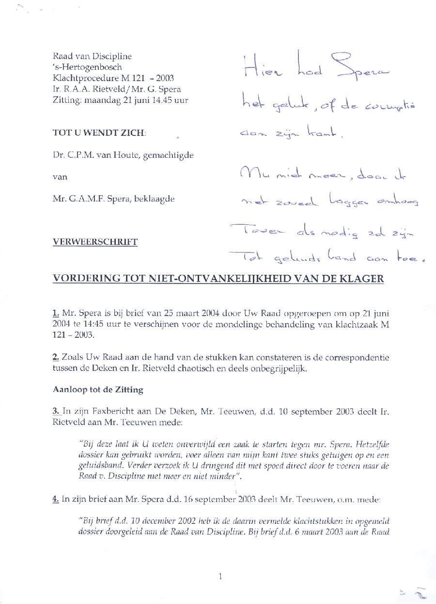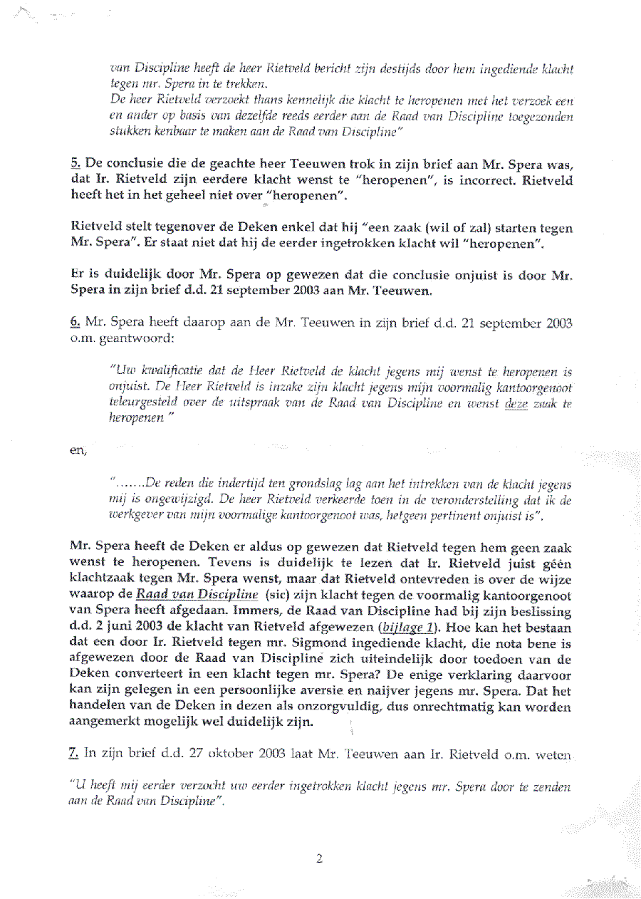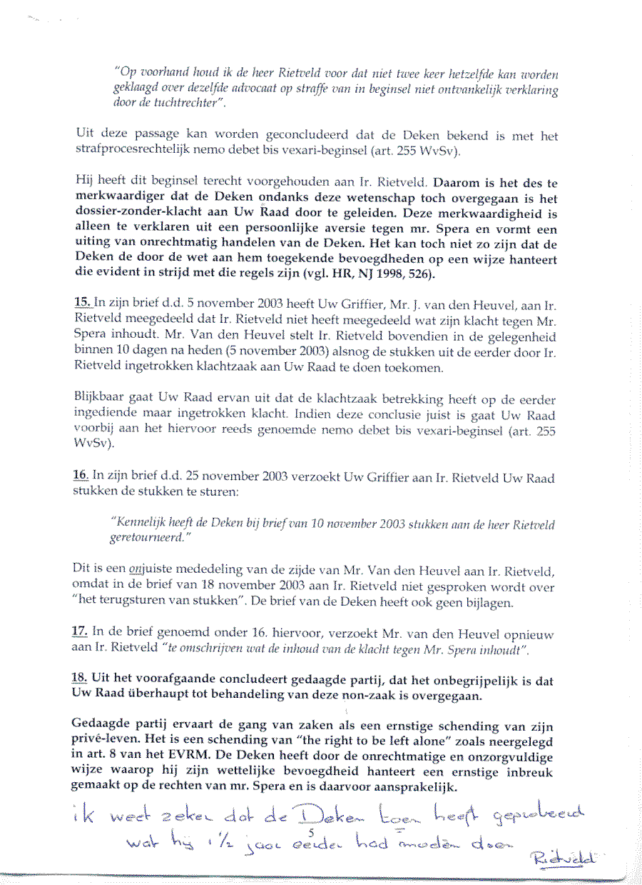 - Voor argumenten tegen de klachten van eisers m.b.t. de vrijheid van meningsuiting in deze zaak verwijs ik u naar het tweede deel waarin advocaat mr. Spera een deel uit een memorie van antwoord heeft overgenomen waarin het grondwettelijke recht van vrijheid van meningsuiting wordt verwoord. Die memorie van antwoord werd in de bodemprocedure ingebracht tegen de aanklacht van Verscholendorp van 15-01-2003, die door Rietveld is gewonnen op 16-8-2003.