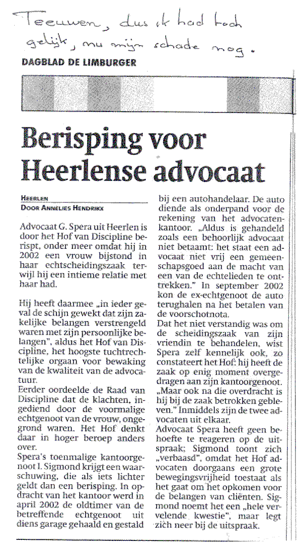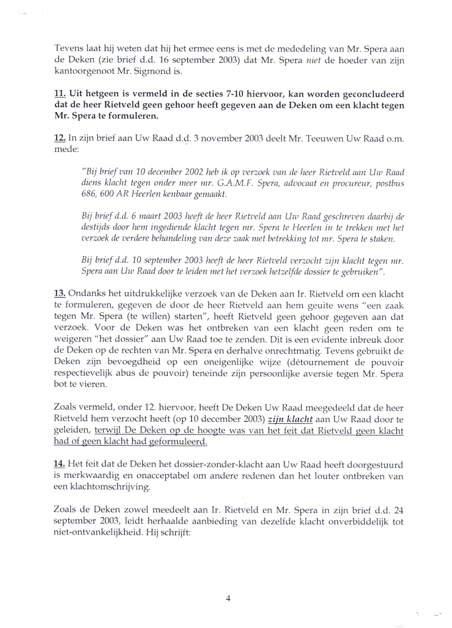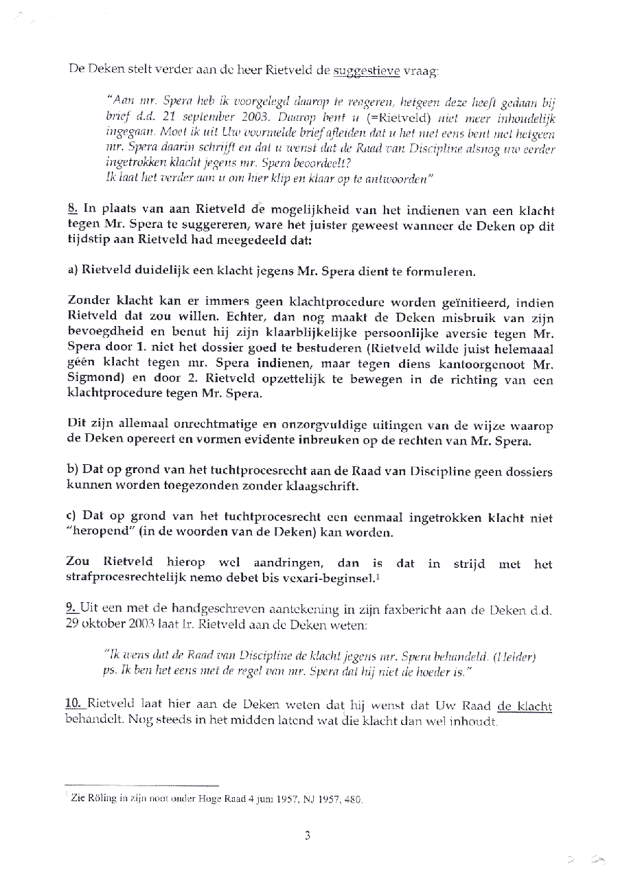 - Voor argumenten tegen de klachten van eisers m.b.t. de vrijheid van meningsuiting in deze zaak verwijs ik u naar het tweede deel waarin advocaat mr. Spera een deel uit een memorie van antwoord heeft overgenomen waarin het grondwettelijke recht van vrijheid van meningsuiting wordt verwoord. Die memorie van antwoord werd in de bodemprocedure ingebracht tegen de aanklacht van Verscholendorp van 15-01-2003, die door Rietveld is gewonnen op 16-8-2003.