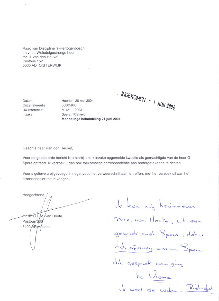 Een heel bijzonder, zeer relevant feit rond deze strafzaak kan uw Hof niet onthouden worden. Namelijk, dat Rietveld tijdens zijn detentie in een politiecel (die integraal betrekking heeft op verwikklingen met deze aan u voorgelegde zaak). Rietveld kon wonder boven wonder zonder veters in zijn schoenen vanuit zijn cel toch een fax te versturen naar de rechtbank in Haarlem. Dit met het verzoek om de rechtszaak wegens smaad/laster tegen mevr. Mesman-Tulp enkele dagen voor de komende zitting in te trekken. Hierdoor behoefden de opgeroepen getuigen E. Zitter en P. van Ginkel (allen eisers in deze zaak) niet voor de rechter te verschijnen. Dit met het gevolg dat de valsheid in geschrifte gepleegd door mr. A.P. Maes, de boze opzet van de BV van met het door hem gefinancierde televisieprogramma en de verantwoordelijkheid van SBS-6 daarvoor, buiten beeld en ongestraft blijven.