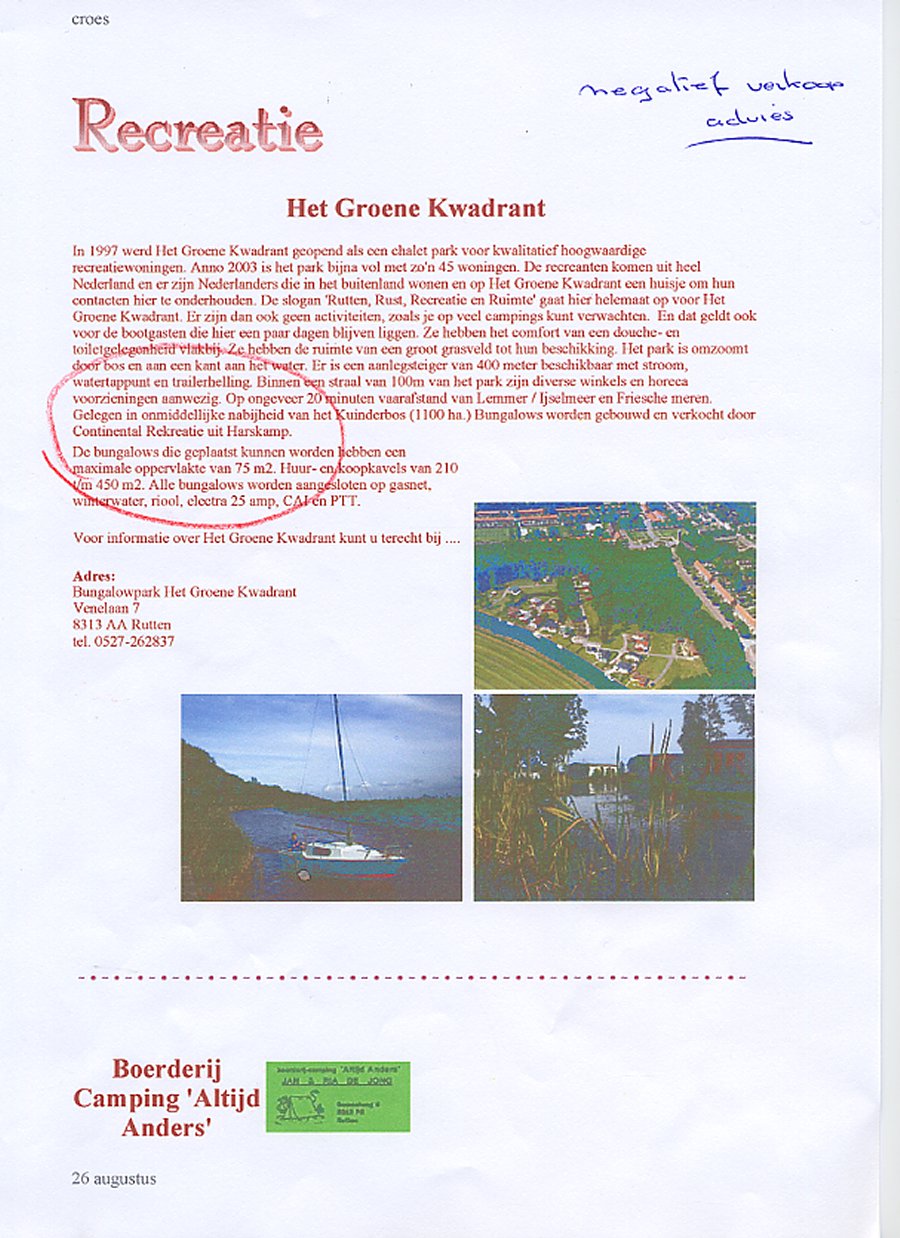 Voorlopige conclusie van Rietveld aan de recreanten en semi-permanente bewoners