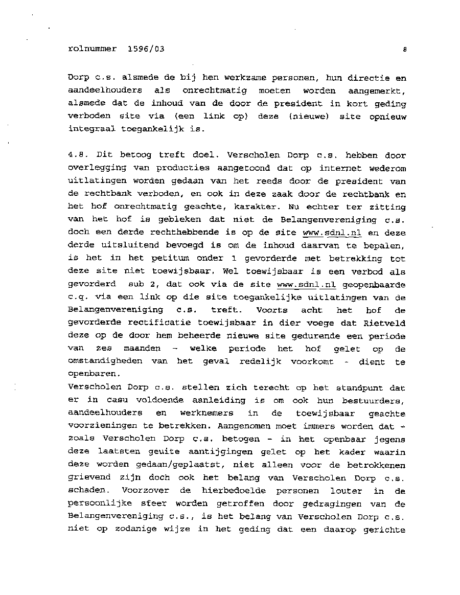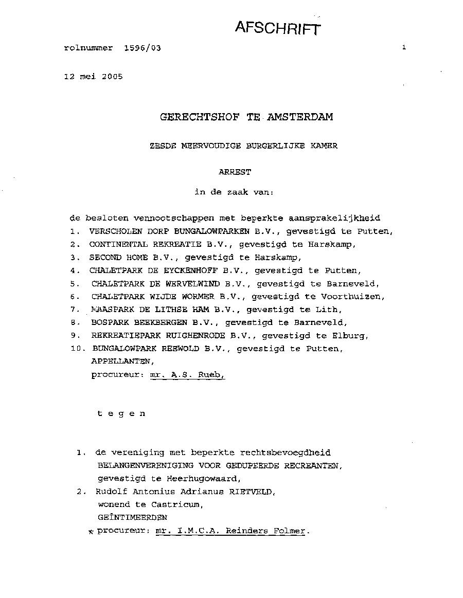 Met kopie naar Mr. N.A.M. Schipper, Gerechtshof te Amsterdam Betreft : Ir. R.A.A. Rietveld legt klacht neer bij Procureur van de Hoge Raad der Nederlanden met betrekking tot rol 1596/03 Verscholen Dorp – Rietveld in een procedure bij het Gerechtshof in Amsterdam, Geachte Mr. J. van Soest Bij deze laat ik u weten dat de uitspraak die gedaan is door rechter Mr. Van Tuyll van Serooskerken-Roëll geen rechtsgeldigheid bezit. Er ontbreken aan deze uitspraak een aantal wettelijk voorgeschreven details en bevat deze uitspraak een aantal vormfouten. Het 'afschrift conform' is niet geïdentificeerd, de adellijke titel van Barones is niet vermeld in de naamstelling en er ontbreekt de wettelijke tekst [in aanwezigheid van de griffier, met initialen en handtekening]. Ik verwijs voor een correcte rechtsgang naar de analyse van Prof. van Putten op website bij de St. Sociale Databank Nederland op adres: http://www.sdnl.nl/van-putten.htm Verder wordt in de uitspraak alleen verwezen naar de Kortgedingprocedure die werd voorgezeten door Mr. A.L. Croes op rolnummer 01-890 met de uitspraak van 25-10-2005, waardoor juist het hele rampenscenario bij en door is ontstaan. In de uitspraak van het Gerechtshof van 12 mei 2005 wordt om onbegrijpelijk reden geen aandacht besteed aan de uitspraak van drs. mr. J. Blokland in de bodemprocedure, waaruit bleek dat de advocaat van Verscholen Dorp (wederpartij) dode en niet-bestaande eisers in het geding bracht. Dit werd met voorkennis door rechter A.L. Croes van de rechtbank in Alkmaar getolereerd. Verder is dit zwaar strafbare feit door iedereen getolereerd en genegeerd. Niet alleen door President N.A.M. Schipper van het Gerechtshof te Amsterdam, (Zie de brief van de heer Brockhus) maar ook en opnieuw door de Meervoudige Zesde Kamer van het Gerechthof in Amsterdam voorgezeten door Mr. Van Tuyll van Serooskerken-Roëll. Alles in deze onverkwikkelijke zaak heeft te maken met het afdekken van onwettig gedrag van diverse Hoofdofficieren van Justitie, advocaten en zelfs van rechters. Dezen hebben geweigerd gevolg te geven aan het vervolgen van meerdere advocaten die bewijsbaar valsheid in geschrift en in gerechtelijke procedure hebben gepleegd, waaronder mr. A.P. Maes van Dommerholt van Dijk Advocaten. Nogmaals verwijs ik naar de documentatie van Prof. dr. ir. Anton. F.P. van Putten [ www.sdnl.nl/van-putten.htm ] Een kopie van deze brief gaat zoals vermeld naar de Minister van Justitie, president mr. L. Koster van de rechtbank in Alkmaar, de Tweede Kamercommissie voor Justitie en naar president mr. N.A.M. Schipper van het Gerechtshof in Amsterdam. Hoogachtend