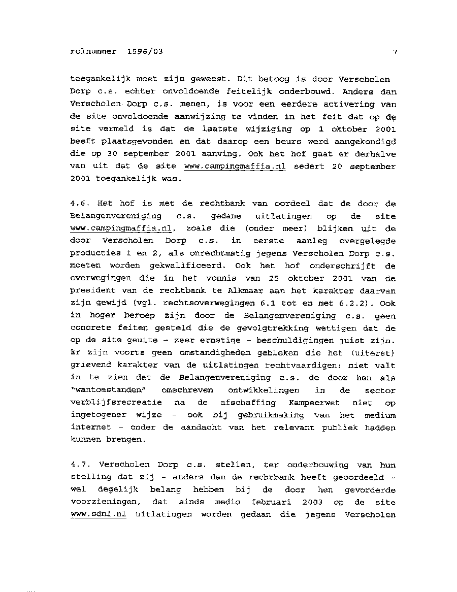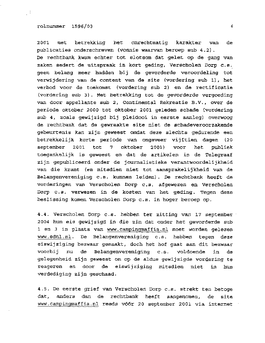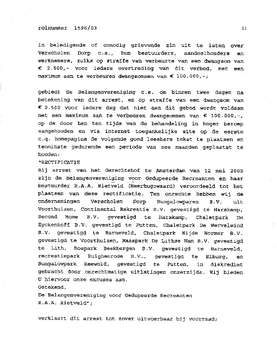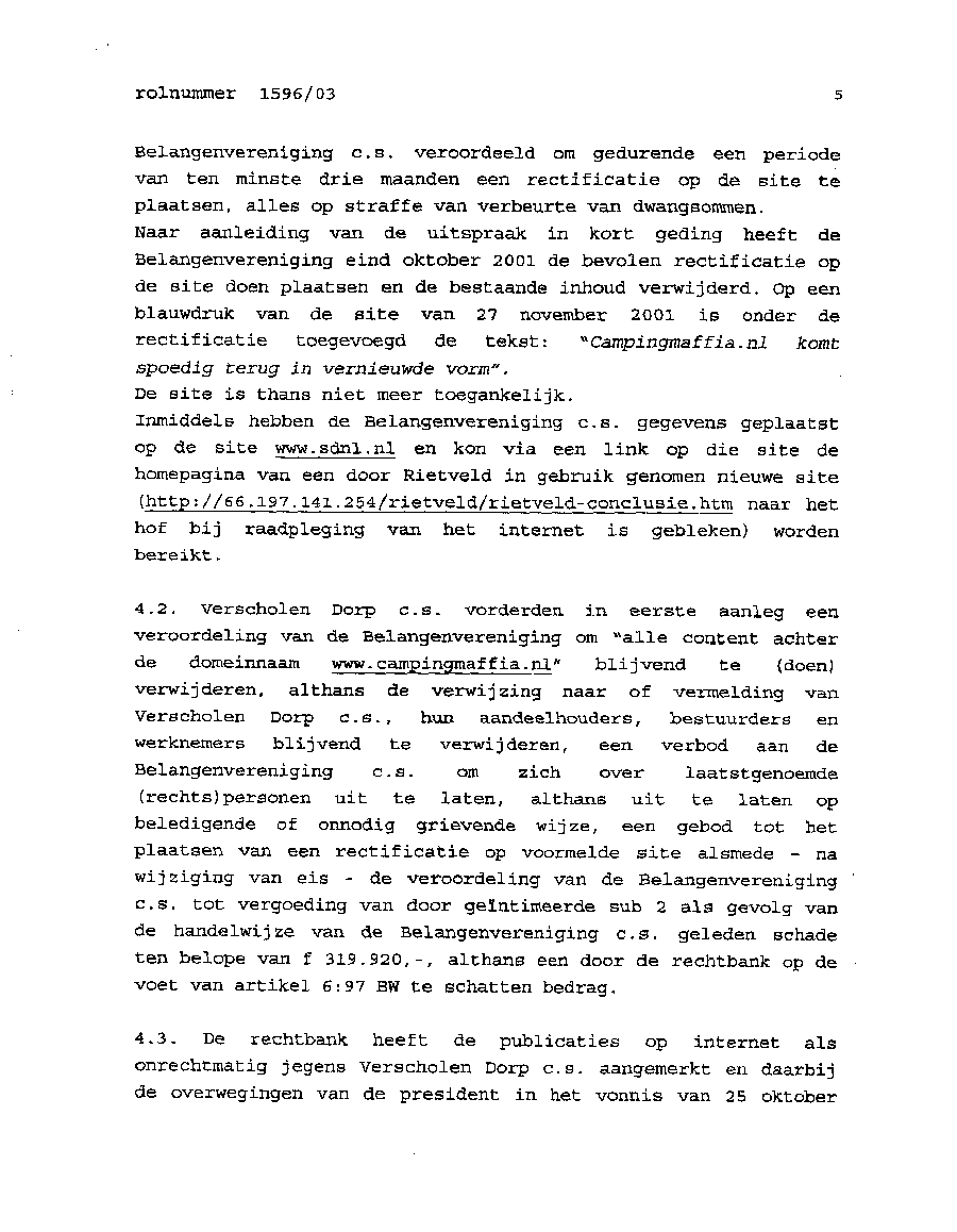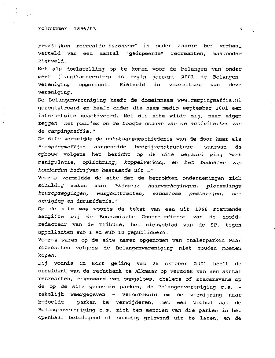 Castricum, 2 februari 2004 Bij deze mijn reactie op de uitspraak van Gerechtshof Amsterdam die werd doorgedramd door Hoofdofficier A.O. Kerk te Alkmaar. Zie de documenten betreffende deze corrupte en verdoezeling van feiten elders op deze site.Alleen Mw. Mesman zit nu mog in deze strafzaak die juist is opgezet door het stuk schorem als Bergervoet en zijn goedbetaalde smeerlappen van Dommerholt van Dijk advocaten te Zwolle, door de criminele advocaat Maes; en in Apeldoorn de advocaat Lodestijn en zijn vroegere kantoorgenoot Rudger Sark, met de zachte 'G' van Maria van de Berg [Verscholen Dorp]. Ach Rudger, wat hebben wij toch een geluk gehad met het kortgeding op 16-10-2001. De afluisterende overheid moet je wel kwaliteit in huis hebben. Rietveld heeft deze tekst namelijk, en volgens Remi Poppe op de website van de SP, ben ik de beste - je zou het haast gaan geloven. Maar jij, goudeerlijke zakenman Bergervoet sr., gaat bij elke onrechtmatige uitspraak die door Justitie wordt gedaan steeds verder de boot in en verliest de overheid steeds meer kracht. Vrijheid van meningsuiting is een groot goed in Nederland en dat document van een der advocaten heb ik ingelijst. En een hoger beroep van dat Bergervoetentuig kan het gerechtshof Amsterdam zien als stemmingmakerij [kan nooit geen smaad/laster wezen]. Dit geeft nog eens te meer aan dat de uitspraak van 25-10-2001 ronduit belachelijk en dwalend is geweest. Daar bovenop is door Rietveld de bodemprocedure gewonnen betreffende deze zaak. Dus laat de hogerberoepzaak van dat kamperstuig seponenren beste mrs. van der Reep, Aben en Rang. Misschien geldt smaad/laster alleen als je prof. Smalhoud bent. Maar deze zaak begint nu echt een beetje uit de klauwtjes te lopen mijne heren en dames. Maar ik heb documenten genoeg om nog jaren te baggeren en een ieder bij Justitie en de verdere corrupte puinhoop bij de overheid totaal onderste boven te halen, net als bij de FIOD. Nette burgers slopen kunnen jullie wel. De kampers moet je slopen, daar hebben jullie zonder resultaat al miljoenen voor uit gegeven. Maar wat is het geworden? Onroerend goedbelasting op recreatiewoningen, omdat er gestopt moest worden met Bergervoet en omdat zijn vriendjes tot het koningklijk huis behoren. Zo zit het bij de corrupte overheid. Maar het komt boven water, al moet ik half Nederland omspitten.