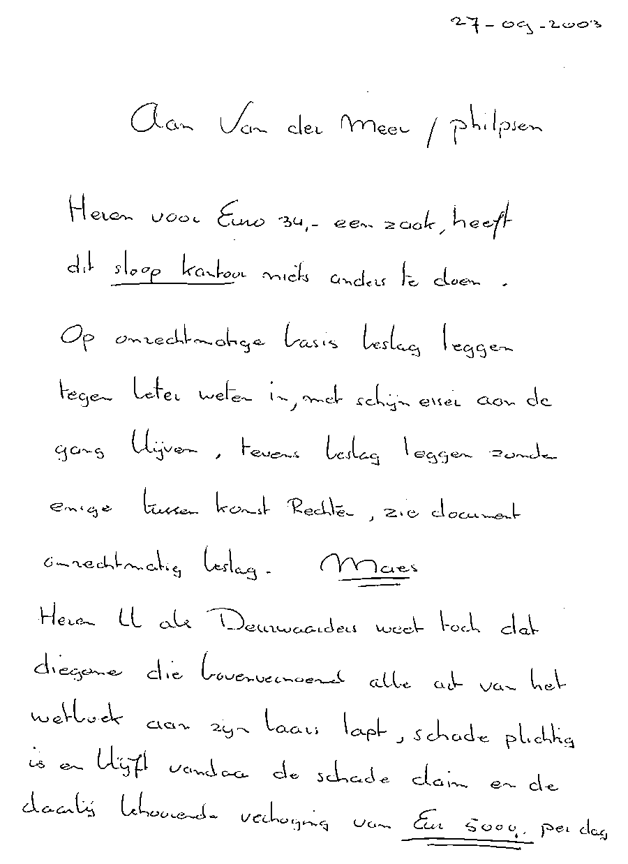 Faxbericht aan mr. Maes van Kees Griesdoorn over schijneisers