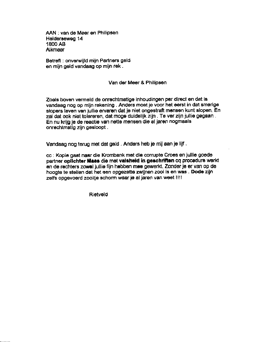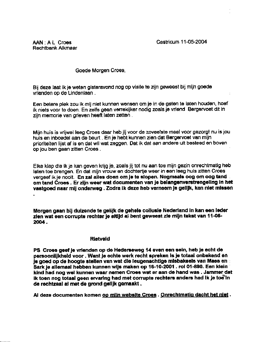 Tot slot Croes, door jou ben ik alles kwijtgeraakt. Tevens raakt door jou mijn dochtertje ernstig beschadigd, omdat zij wederom in een leeg huis zit. En dit niet zoals Koster heeft aangegeven doordat Rietveld onwillig is. Maar Rietveld geeft niet toe aan een bewust veroorzaakte puinhoop. Ik zal je hiervoor nu het volgende duidelijk maken. Croes jij verliest ook de inboedel van je huis voor 100%, neem dit van mij aan. En ik zal je niet moeten tegenkomen in het dorp Bergen, en die kans is zeer groot.