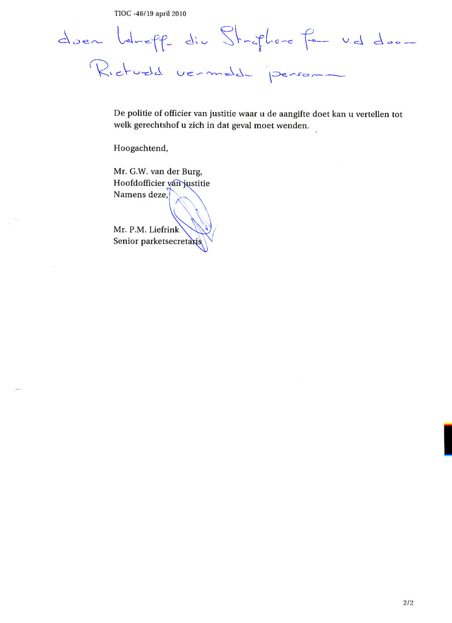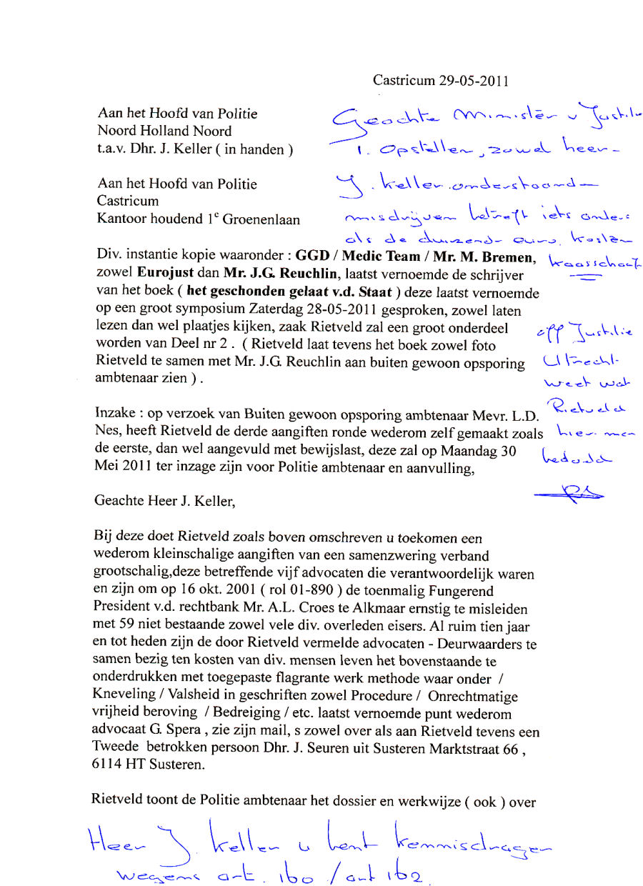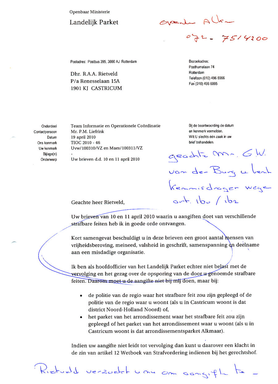 Aan: Mr. G.W. van der Burg (hoofdofficier van Justitie)Organisatie: Landelijk Parket Openbaar Ministerie Rotterdamden Haag Adres: Posthumalaan 74 Plaats: 3000 AJ Rotterdam Inzake: Uitnodiging van uw persoon/organisatie om volgens de wettelijke verplichting volgens B 162 Sv als kennisdrager aangifte te doen van bij u bekende en bewijsbare strafbare feiten, die gepleegd zijn door een derde. Geachte mr. van der Burg, Hierbij voeg ik enkele bewijzen toe ( er zijn er meer indien nodig) aan deze uitnodiging van uw kennisdragerschap over bij u bekende en bewijsbare strafbare feiten, die zijn gepleegd door een derde persoon of organisatie, waarvoor in geval van een maatschappelijk instelling het bestuur verantwoordelijk is. Met vriendelijke groet