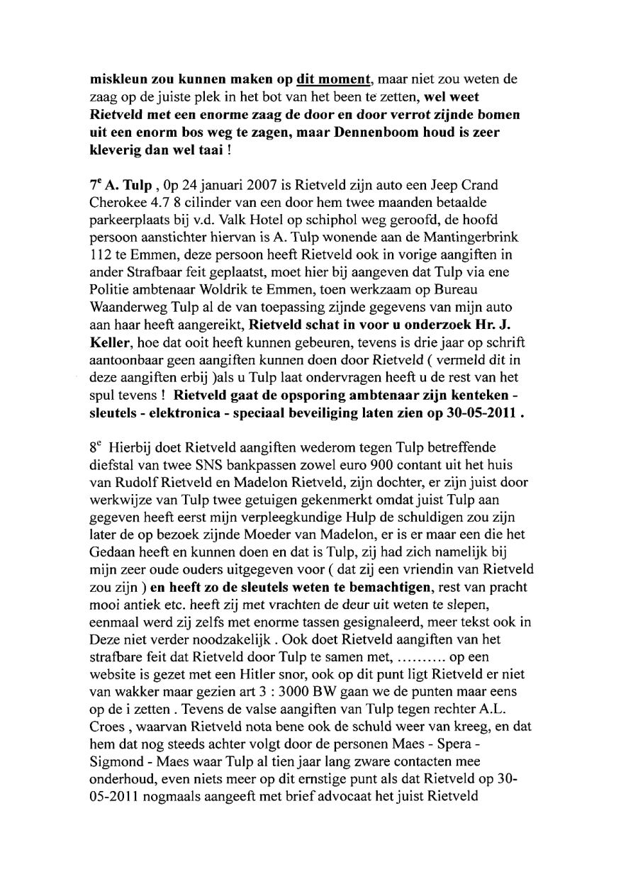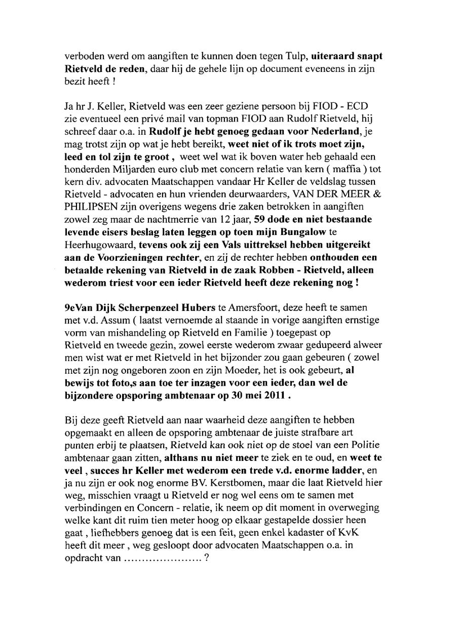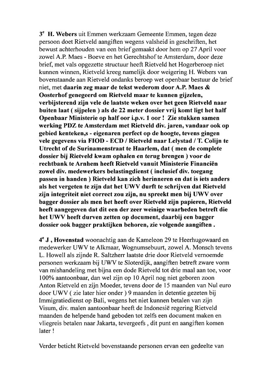Aan alle volksvertegenwoordigers, ministers, justitiële en politieambtenaren, mijn verslag van overheidsfraude in de brief aan minister Opstelten over binnenvallen van politie in opdracht van de Officier van Justitie. Zie Deel I en Deel II van het interview, waarin misbruik van bevoegdheden en manipulatie met boze opzet verklaard worden. Deel III kan aanleiding zijn voor een kabinetscrisis omdat de ministers Donner en Verhagen verantwoordelijk zijn voor de uitwassen bij het UWV, het CJIB, de ambassade in Jakarta en het beleid voor Justitie en Buitenlandse Zaken. N.B.: Alle uitlatingen vallen strikt onder de verantwoordelijkheid van Ir. R.A.A. Rietveld.