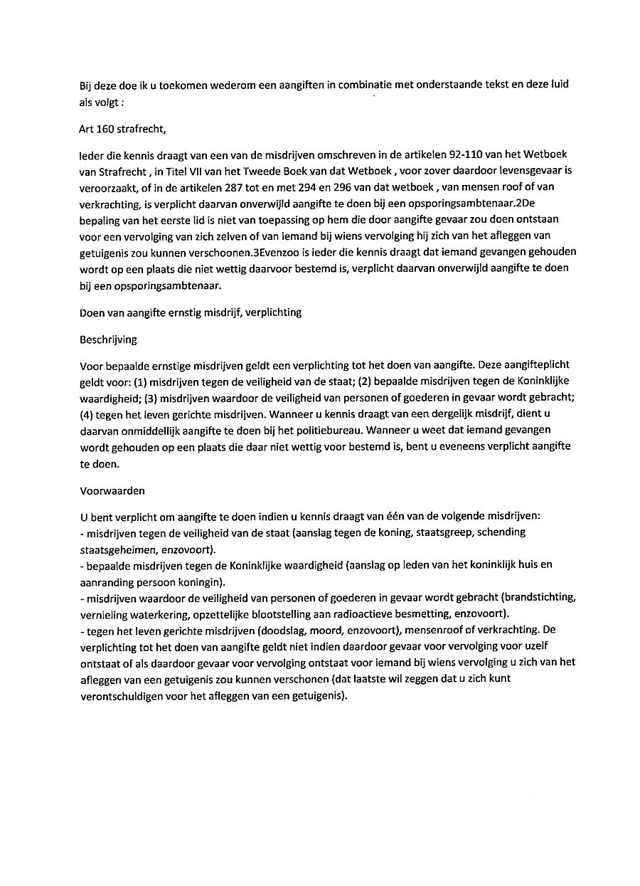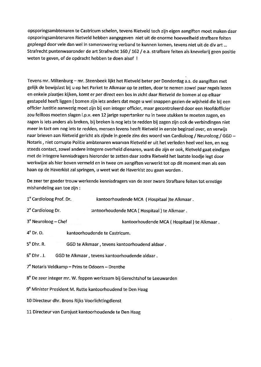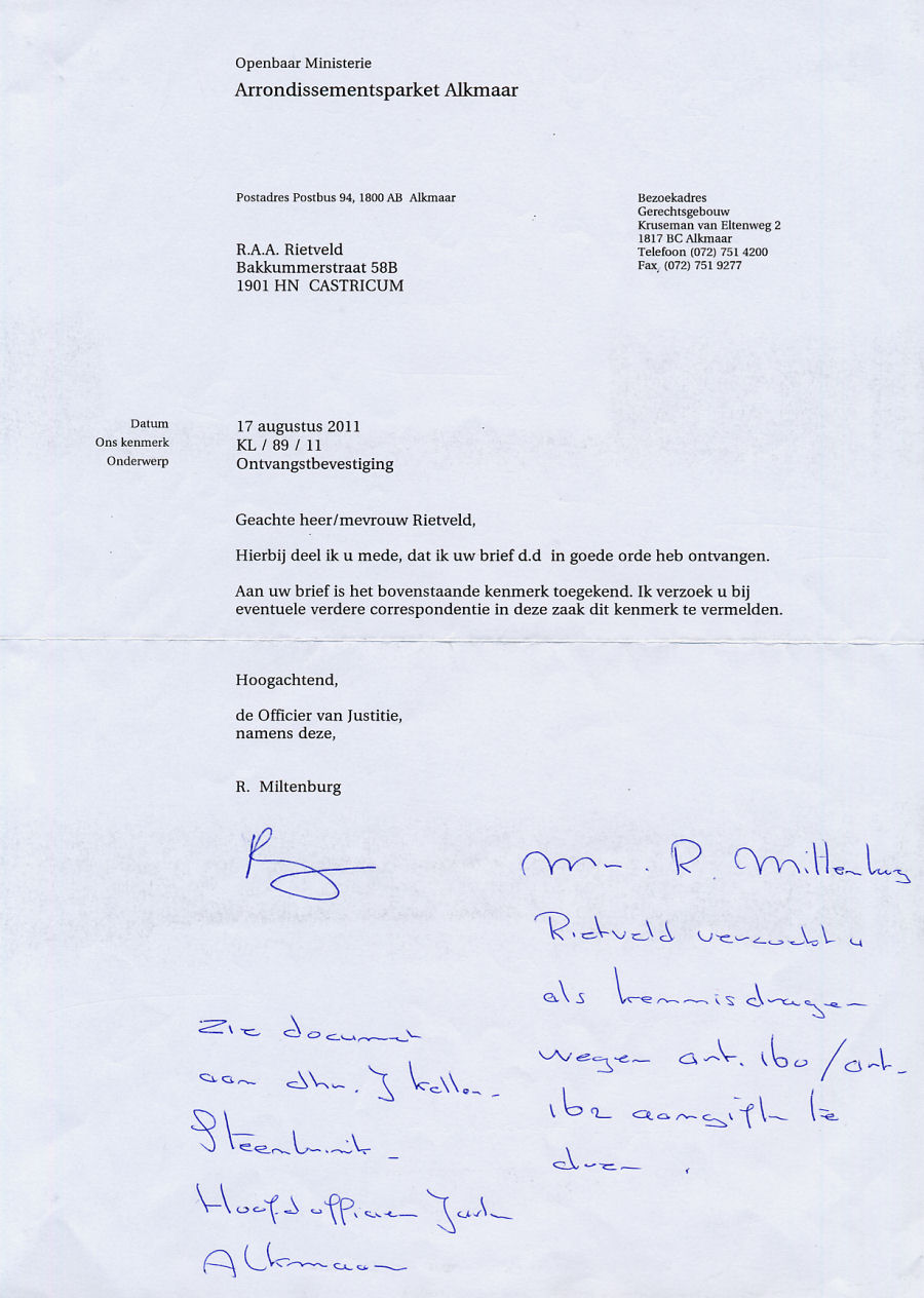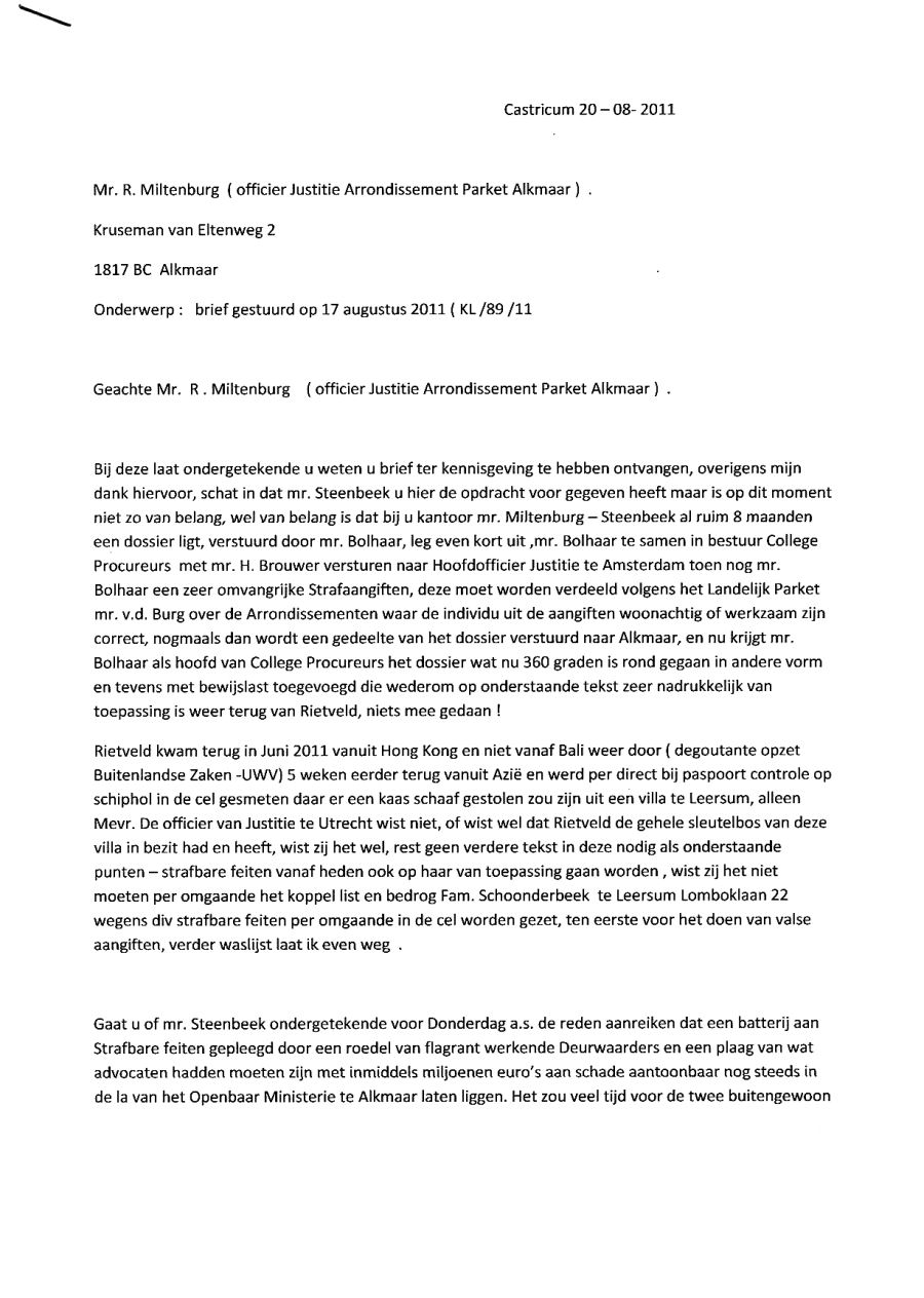 Aan: Arrondissementsparket AlkmaarAdres: Kruseman van Eltenweg 2 Plaats: 1817 BC Alkmaar t.a.v.: Officier van Justitie mr. R. miltenburg Inzake: Uitnodiging van uw persoon/organisatie om volgens de wettelijke verplichting volgens B 162 Sv als kennisdrager aangifte te doen van bij u bekende en bewijsbare strafbare feiten, die gepleegd zijn door een derde. Geachte mr. R. miltenburg, Hierbij voeg ik enkele bewijzen toe ( er meer indien nodig) aan deze uitnodiging van uw kennisdragerschap van bij u bekende en bewijsbare strafbare feiten, die zijn gepleegd door een derde persoon of organisatie, waarvoor in geval van een maatschappelijk instelling het bestuur verantwoordelijk is. Met vriendelijke groet