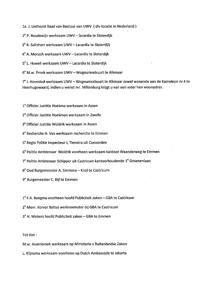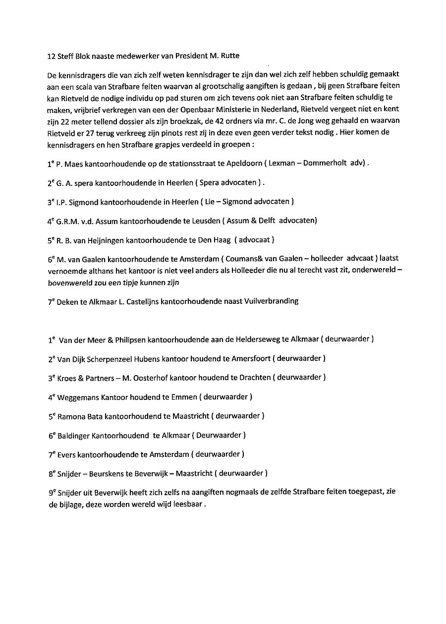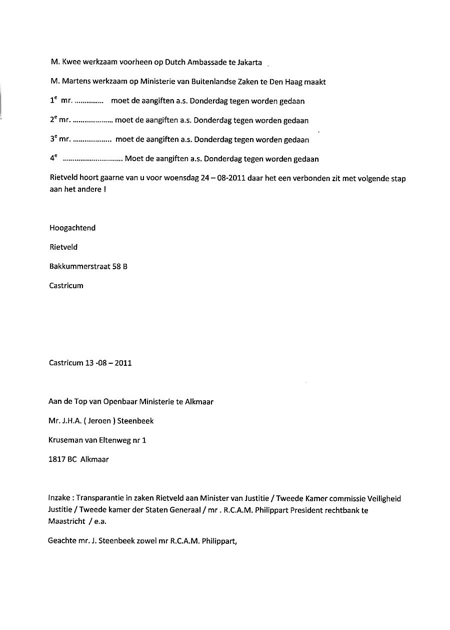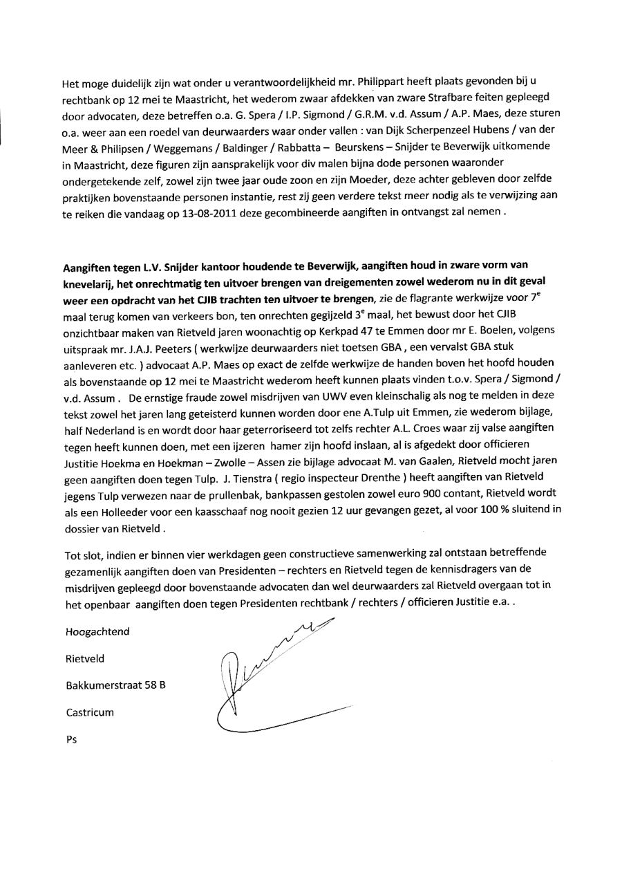 Aan: Arrondissementsparket AlkmaarAdres: Kruseman van Eltenweg 2 Plaats: 1817 BC Alkmaar t.a.v.: Officier van Justitie mr. R. miltenburg Inzake: Uitnodiging van uw persoon/organisatie om volgens de wettelijke verplichting volgens B 162 Sv als kennisdrager aangifte te doen van bij u bekende en bewijsbare strafbare feiten, die gepleegd zijn door een derde. Geachte mr. R. miltenburg, Hierbij voeg ik enkele bewijzen toe ( er meer indien nodig) aan deze uitnodiging van uw kennisdragerschap van bij u bekende en bewijsbare strafbare feiten, die zijn gepleegd door een derde persoon of organisatie, waarvoor in geval van een maatschappelijk instelling het bestuur verantwoordelijk is. Met vriendelijke groet