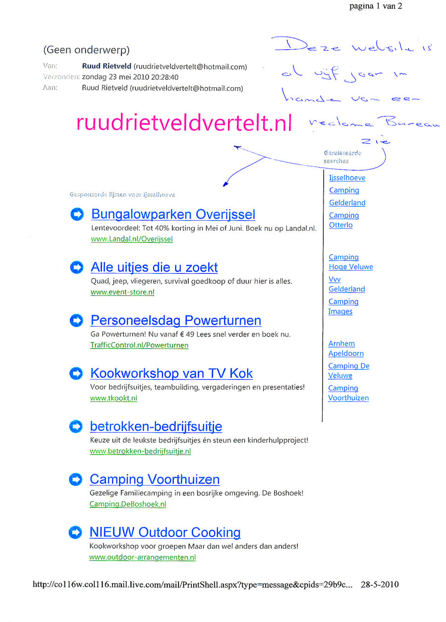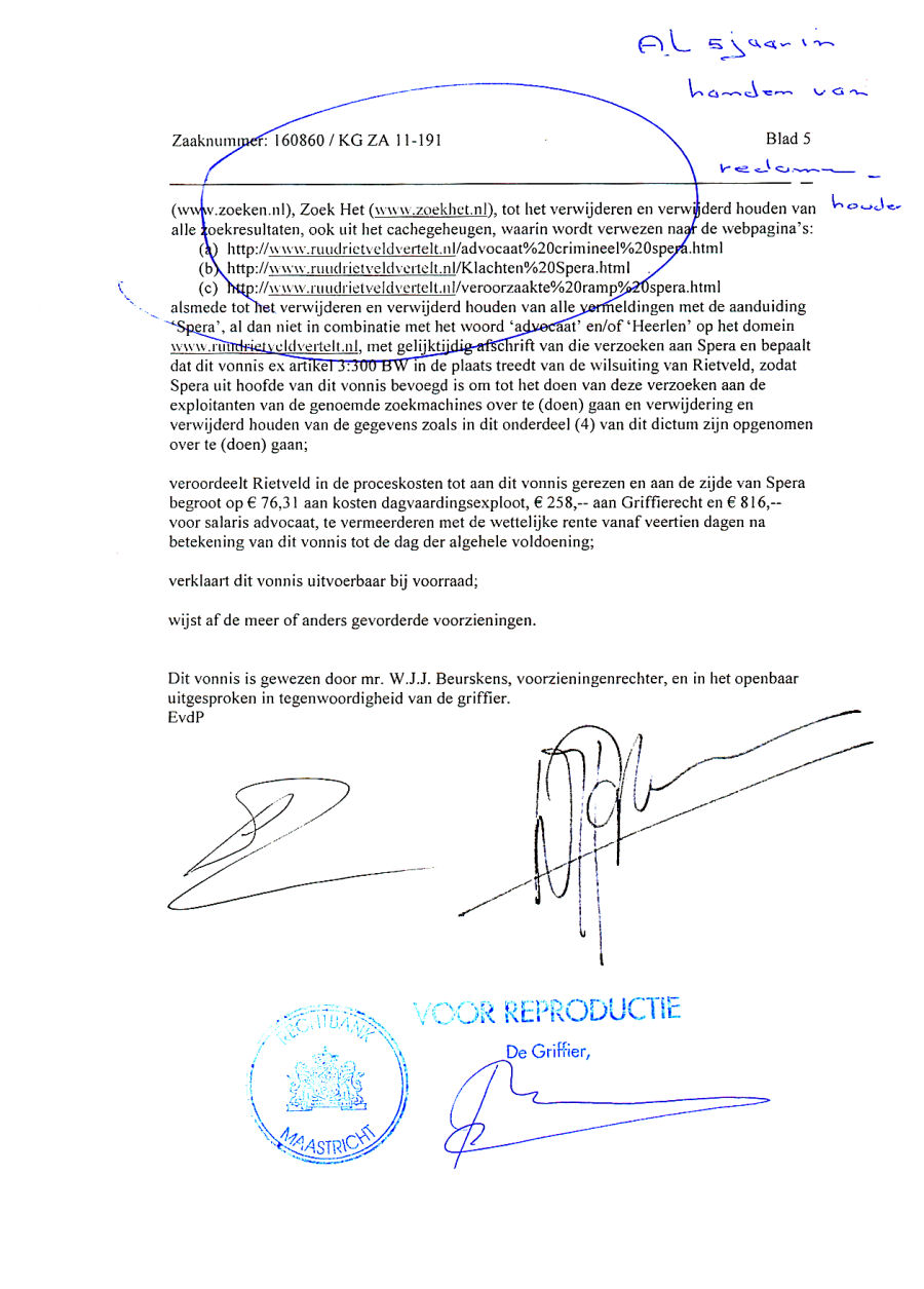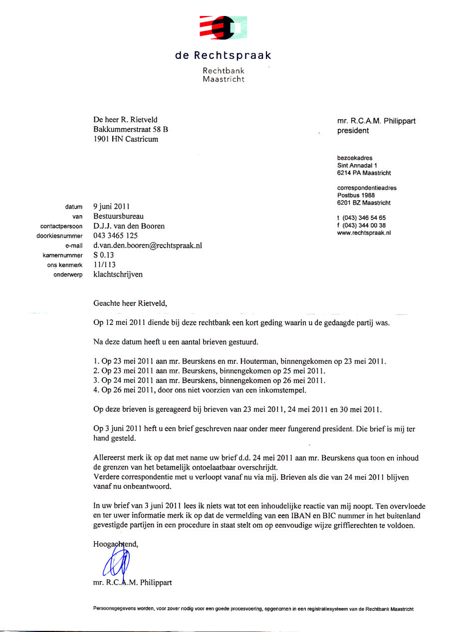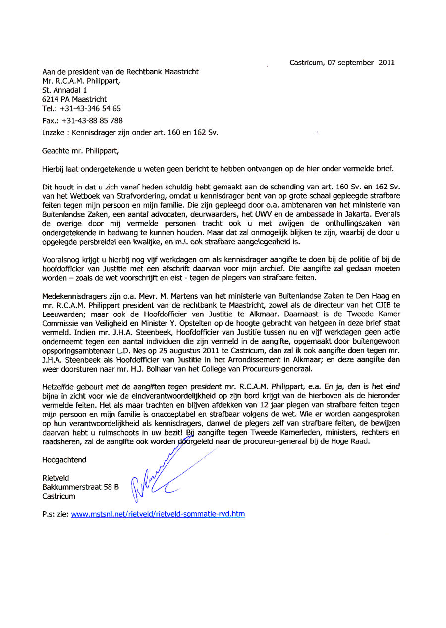Aan: mr. R.C.A.M. PhilippartAdres: St. Annadal 1 Plaats: 6214 PA Maastricht Inzake: Uw weigering van het als kennisdrager doen van aangifte van strafbare feiten, volgens 162 Sv van het wetboek van strafvordering wegens bewijsbare strafbare feiten, die gepleegd zijn door derde(n). Geachte mr. Phillipart, Hierbij stel ik u op de hoogte van het vastgestelde feit dat u de termiijn van reageren met een aankondiging van het doen van aangifte als kennisdrager tegen personen, waarvan u weet hebt en bewijs dat deze(n) strafbare feiten hebben gepleegd. Hierbij voeg ik enkele bewijzen toe (meer zijn beschikbaar indien nodig) aan deze uitnodiging van uw kennisdragerschap van bij u bekende en bewijsbare strafbare feiten, die zijn gepleegd door een derde persoon of organisatie, waarvoor in geval van een maatschappelijke instelling het bestuur medeverantwoordelijk is. Hoogachtend,