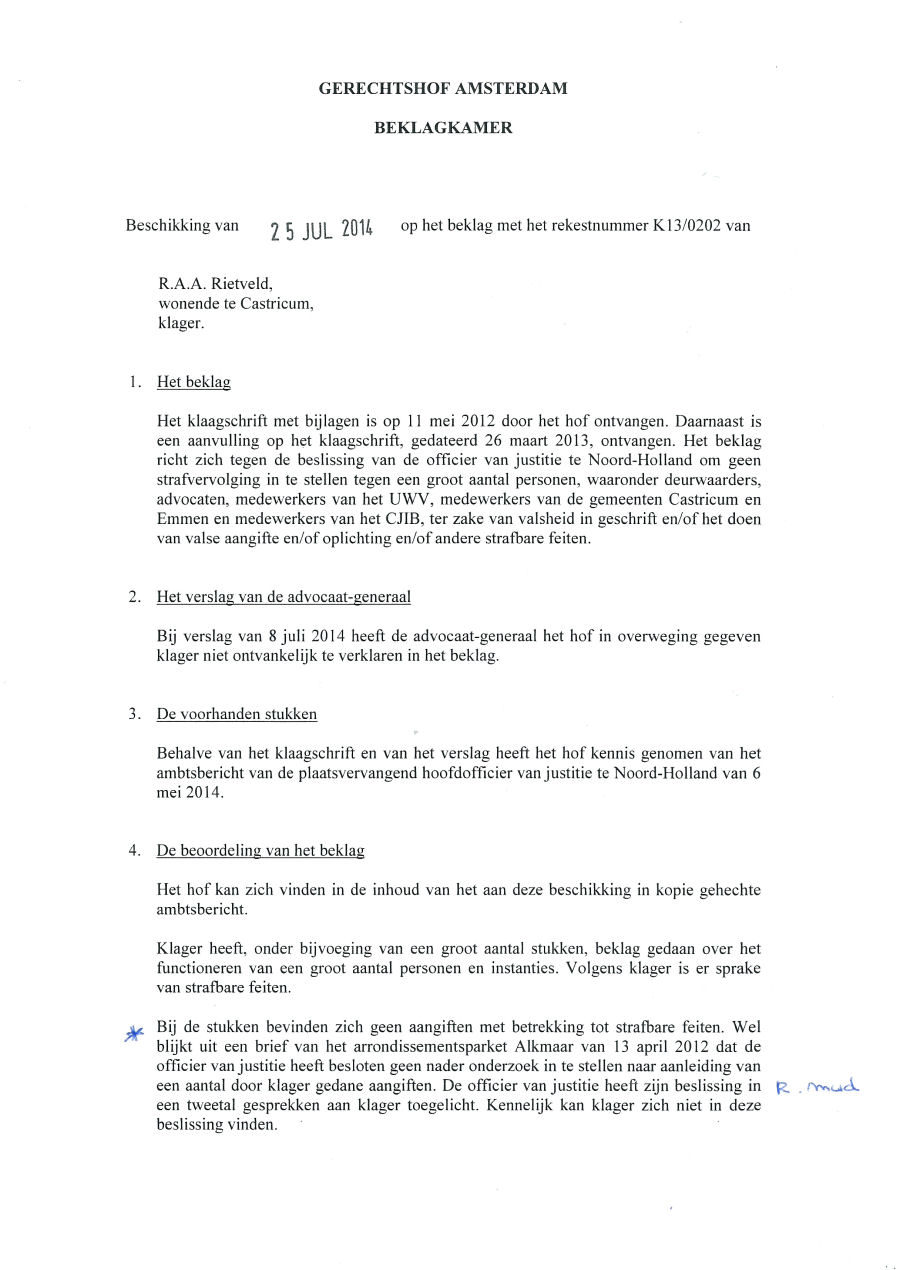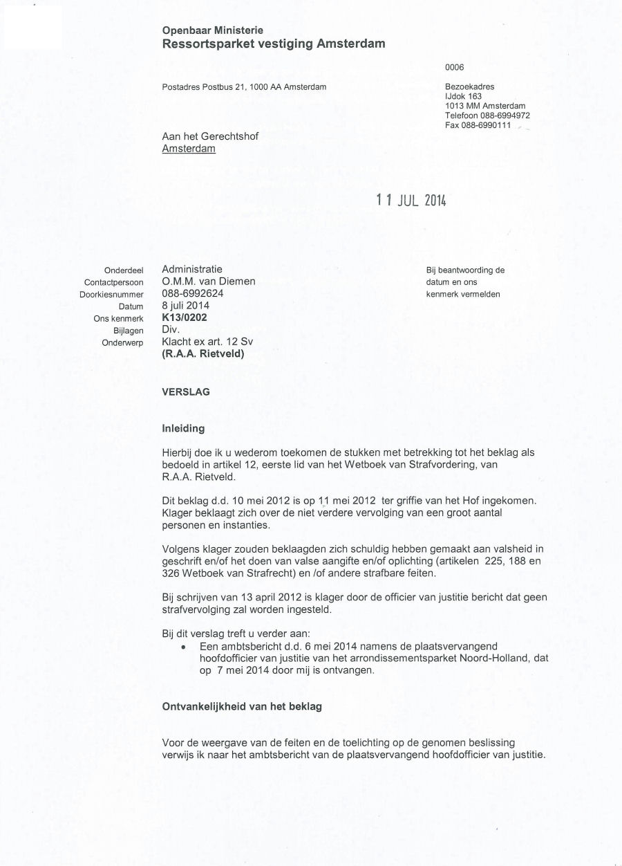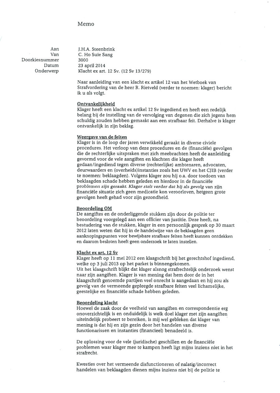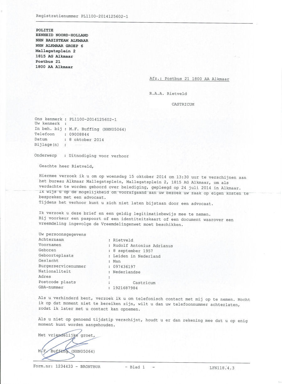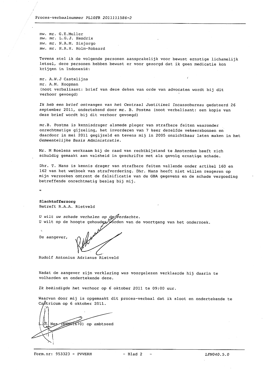 AANTEKENEN President van de rechtbank Maastricht Geachte mr. Beurskens en Philippart Bij deze verwijs ik u naar het concept dat ik ontving van de SDN. Ik zal dat concept samenvoegen met deze aangetekende brief aan u beiden over zaken betreffende mijn correspondentie met o.a. premier Rutte. Ik zend u ook kopieën van de correspondentie van de RVD aan mijzelf, evenals de briefwisseling met de Tweede Kamercommissie voor Veiligheid en Justitie. Alles draait om de flagrante werkwijze die in de rechtszaak van 12 mei 2011 is gebezigd in de zaak versus Rietveld. Ik bemerk dat u de enorme zeepbel die boven deze zaak hangt in uw rechtssysteem, waartoe ook u klaarblijkelijk wilt behoren gezien uw brief aan mij en het oorverdovende zwijgen daarna, niet wilt laten uit elkaar spatten. Maar dat is echt niet meer tegen te houden. Wel bied ik u mr. Philippart en rechter Beurskens nog een tweede maal de mogelijkheid om samen met ondergetekende aangifte te gaan doen. Als kennisdrager van strafbare feiten bent u net als elke andere burger verplicht om daarvan aangifte te doen bij de politie, de hoofdofficier van Justitie en eventueel bij de minister zelf. In deze bent u net als ik een burger met rechten en plichten. U weet beiden dat de zeer bizarre uitspraak op 17 mei 2011 tot doel had om mij onschadelijk te maken en te proberen mij onder een vorm van curatele te laten stellen, wat nooit zal lukken; eerder omgekeerd. Daarna hebt u mr. Philippart getracht mij nog verder te beschadigen met uw bedreigende brief van 9 juni 2011. Daar lig ik overigens echt niet wakker van; en met reden meneer Philippart. De bewijslast waarover ik beschikt van 60 cm dik lag ook voor de ogen van rechter Beurskens, wat zelfs door de politie wordt beschouwd als niet mogelijk qua vonnis, maar dat is onbegrijpelijkerwijs wel zo. Rechter Beurskens zei tegen mij tijdens de zitting: “U bepaald wat u mij wil geven”. Nog voordat ik het bewijsmateriaal heb kunnen aanreiken deed mr. Beurskens een uitspraak in zijn vonnis dat haaks staat op wat te verwachten was, namelijk het afdekken van fraude en valsheid in geschrift, gepleegd door de voornoemde advocaten. Daarnaast blijkt achteraf dat mr Beurskens ook nog belangenverstrengeld is als betrokkene bij een deurwaarderskantoor. Een bijzonder aspect is de valse aangifte bij de politie in Emmen zo’n 400 kilometer naar het noorden. Waarom is dat meneer Philippart? Ik kan ook dat u haarfijn uitleggen. De (integere) officier Justitie in uw arrondissement kent hem hoogstwaarschijnlijk net zo goed als ik. Vandaar dat hij bij zijn vriendje A.P. Maes in Emmen (met die 59 niet-bestaande getuigen) op valse grond bij H. Vos van de recherche zorgde dat deze daar wel een aangifte op rol kreeg; en wel op zaterdag in het gesloten politiebureau te Emmen. Vandaar dat die meneer Vos door de integere voorzitter van de Strafkamer: Mr. W. Foppen van het gerechtshof te Leeuwarden, in nog geen 15 minuten in mootjes gehakt werd; net als het geboefte A.P. Maes die in 2001 de verzinner was van een lijst met 59 niet-bestaande, dan wel een reeks dode eisers. Eerder heeft ook Mr. N.A.M. Schipper, toen als president te Amsterdam, zware averij opgelopen. Ook hij was kennisdrager van strafbare feiten en liet dat gewoon toe. Een ding is nu zeker anders en dat staat hierboven al vermeld. De zaak Rietveld zit in de hoogste regionen van de politiek; want ook de heer Brons, directeur RVD, krijgt deze documentatie van mij. Premier Mark Rutte krijgt de bevestiging zoals hij mij in het verleden heeft laten weten over mijn zaak, dat die naar Stef Blok is doorgestuurd. Eergisteren is nu ook Emile Roemer van de SP door de redactie van de SDN op de hoogte gesteld van kwalijke zaken rond de Rietveld-affaire waarover de parlementaire pers door de RVD opgelegd geen vragen mag stellen aan de minister-president. Ook fractievoorzitter Job Cohen van de PvdA is eind vorig jaar al geattendeerd op schandalige praktijken binnen het rechtsbedrijf. U snapt natuurlijk heel goed dat ik persoonlijk ervoor zorg dat het nu weer bij de premier Rutte en de heer Brons van de RVD terecht gaat komen. En ja, dan hoeft de RVD in ieder geval niet meer het verbod uit te vaardigen aan een erelid van de parlementaire pers om geen vragen over de zaak-Rietveld te stellen. Ik eindig met deze tekst zoals ik hem ook begonnen ben, om u alsnog te verzoeken en wettelijk te eisen dat u samen met ondergetekende aangifte gaat doen tegen de knevelarij en andere onwettige praktijken. Dit wegens het liegen en bedriegen van rechters op rij, met praktijken waar de vastgoedonderwereld nog wat van zou kunnen leren. En ja, Rietveld komt nogal eens bij T. Colijn te Utrecht, voorheen aan de Surinamestraat te Haarlem. Niet heel Nederland is corrupt meneer Philippart. Het vonnis gaat met de bewijslast ter beoordeling over 14 dagen naar de juiste persoon zoals aangegeven. De heer Seuren is ook zwaar slachtoffer. Men houdt mij zoals tientallen anderen zeer goed op de hoogte. En ja, heer Philippart, naar gelang ik verder ga begint de Politie redelijk inzicht te krijgen in wat van hoog tot laag is geprobeerd om het advocatengilde met uw systeem beschermd te houden. Ik verwijs u naar de conceptbrief van de SDN aan u die ik bij deze goedkeur, deze toevoeg en ook op het internet laat plaatsen. Ik zal u de bijlagen van diverse politieke instanties eveneens laten toekomen, inclusief het dwangbevel van de rechtbank te Maastricht met zeer groot stempel niet sturen. Met welke reden heeft Rietveld hem dan toch verkregen? Krijgt Nederland eindelijk een advocatuur waar mr. Bolhaar van het College Procureurs-generaal zo graag zou hebben dat deze integer was, net als Rietveld dat ook wil? Bolhaar en ik kennen elkaar van een groot dossier op een ander gebied. Het advocatentuig moet in de cel meneer Philippart en integere advocaten niet nog langer de dupe laten worden van wat een integer systeem zou moeten zijn. Men heeft het laten afzinken tot zelfs een criminele organisatie. Bewijzen liggen met cent