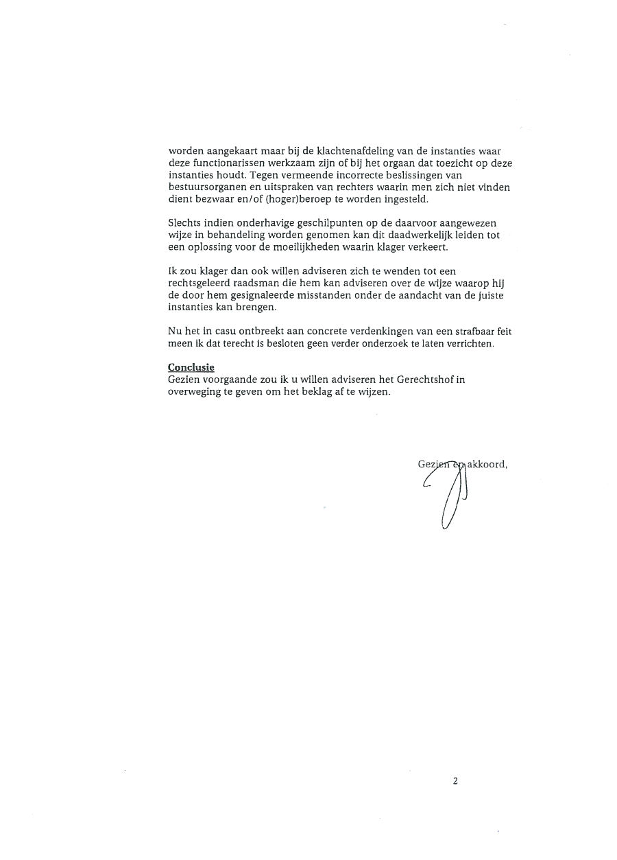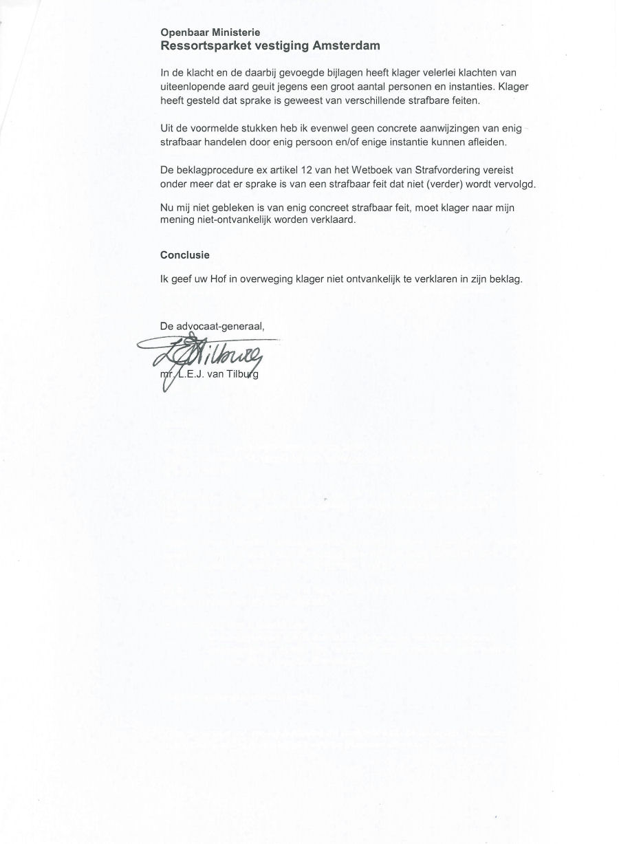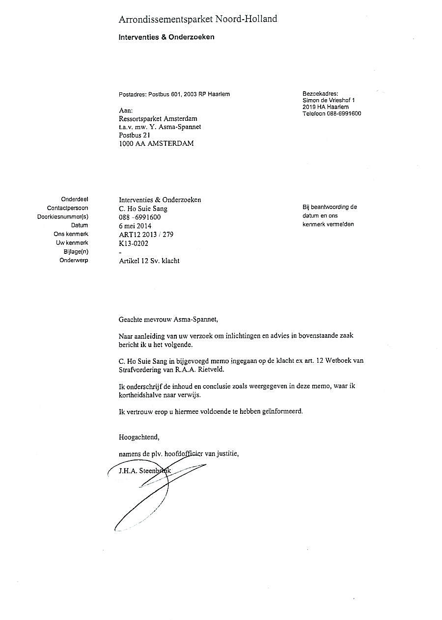 Enige tijd geleden heb ik u een aangetekende brief gestuurd m.b.t. de wettelijke verplichting als kennisdrager (met name beëdigde functionarissen), om vanwege art. 160 Sv en 162 Sv van het wetboek van strafvordering aangifte te doen van strafbare feiten, waarvan u als kennisdrager wetenschap hebt. Tot nu toe heb ik van u geen inhoudelijke reactie hierover mogen ontvangen. Zoals ik u heb laten weten hebt u uw kortgedingrechter mr. W.J.J. Beurskens uit de wind proberen te houden door zijn bewust dwalende vonnis inzake de frauduleuze activiteiten van de ronduit criminele advocaten af te dekken. Voor het overige blijven van kracht de al eerder opgestelde processen-verbaal door Buitengewoon Opsporingambtenaar mevr. D. Nes en collega.