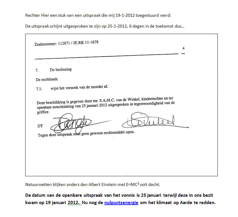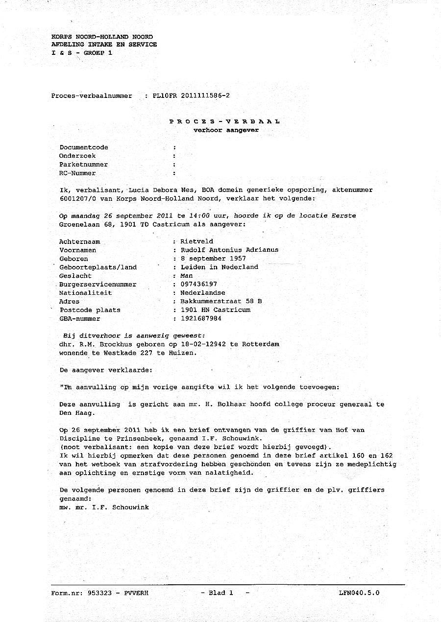 AANTEKENEN President van de rechtbank Maastricht Geachte mr. Beurskens en Philippart Bij deze verwijs ik u naar het concept dat ik ontving van de SDN. Ik zal dat concept samenvoegen met deze aangetekende brief aan u beiden over zaken betreffende mijn correspondentie met o.a. premier Rutte. Ik zend u ook kopieën van de correspondentie van de RVD aan mijzelf, evenals de briefwisseling met de Tweede Kamercommissie voor Veiligheid en Justitie. Alles draait om de flagrante werkwijze die in de rechtszaak van 12 mei 2011 is gebezigd in de zaak versus Rietveld. Ik bemerk dat u de enorme zeepbel die boven deze zaak hangt in uw rechtssysteem, waartoe ook u klaarblijkelijk wilt behoren gezien uw brief aan mij en het oorverdovende zwijgen daarna, niet wilt laten uit elkaar spatten. Maar dat is echt niet meer tegen te houden. Wel bied ik u mr. Philippart en rechter Beurskens nog een tweede maal de mogelijkheid om samen met ondergetekende aangifte te gaan doen. Als kennisdrager van strafbare feiten bent u net als elke andere burger verplicht om daarvan aangifte te doen bij de politie, de hoofdofficier van Justitie en eventueel bij de minister zelf. In deze bent u net als ik een burger met rechten en plichten. U weet beiden dat de zeer bizarre uitspraak op 17 mei 2011 tot doel had om mij onschadelijk te maken en te proberen mij onder een vorm van curatele te laten stellen, wat nooit zal lukken; eerder omgekeerd. Daarna hebt u mr. Philippart getracht mij nog verder te beschadigen met uw bedreigende brief van 9 juni 2011. Daar lig ik overigens echt niet wakker van; en met reden meneer Philippart. De bewijslast waarover ik beschikt van 60 cm dik lag ook voor de ogen van rechter Beurskens, wat zelfs door de politie wordt beschouwd als niet mogelijk qua vonnis, maar dat is onbegrijpelijkerwijs wel zo. Rechter Beurskens zei tegen mij tijdens de zitting: “U bepaald wat u mij wil geven”. Nog voordat ik het bewijsmateriaal heb kunnen aanreiken deed mr. Beurskens een uitspraak in zijn vonnis dat haaks staat op wat te verwachten was, namelijk het afdekken van fraude en valsheid in geschrift, gepleegd door de voornoemde advocaten. Daarnaast blijkt achteraf dat mr Beurskens ook nog belangenverstrengeld is als betrokkene bij een deurwaarderskantoor. Een bijzonder aspect is de valse aangifte bij de politie in Emmen zo’n 400 kilometer naar het noorden. Waarom is dat meneer Philippart? Ik kan ook dat u haarfijn uitleggen. De (integere ) officier Justitie in uw arrondissement kent hem hoogstwaarschijnlijk net zo goed als ik en dumpte de bagger. Vandaar dat hij bij zijn vriendje A.P. Maes in Emmen (met die 59 niet-bestaande getuigen) op valse grond bij H. Vos van de recherche zorgde dat die daar wel een aangifte op rol kreeg; en wel op zaterdag in het gesloten politiebureau te Emmen. Vandaar dat die meneer Vos door de integere voorzitter van de Strafkamer: Mr. W. Foppen van het gerechtshof te Leeuwarden, in nog geen 15 minuten in mootjes gehakt werd; net als het geboefte A.P. Maes die in 2001 de verzinner was van een lijst met 59 niet-bestaande, dan wel een reeks dode eisers. In 2005 zocht men opnieuw contact met mij om het hogerberoep van Rietveld tegen Sigmond te mogen doen, dan wel om dat te verzieken. De reden is u duidelijk, omdat men weer verdedigde op 12 mei 2011. Eerder heeft ook Mr. N.A.M. Schipper, toen als president te Amsterdam, zware averij opgelopen. Ook hij was kennisdrager van strafbare feiten en liet dat gewoon toe. Een ding is nu zeker anders en dat staat hierboven al vermeld. De zaak Rietveld zit in de hoogste regionen van de politiek; want ook de heer Brons, directeur RVD, krijgt deze documentatie van mij. Premier Mark Rutte krijgt de bevestiging zoals hij mij in het verleden heeft laten weten over mijn zaak, dat die naar Stef Blok is doorgestuurd. Eergisteren is nu ook Emile Roemer van de SP door de redactie van de SDN op de hoogte gesteld van kwalijke zaken rond de Rietveld-affaire waarover de parlementaire pers door de RVD opgelegd geen vragen mag stellen aan de minister-president. Ook fractievoorzitter Job Cohen van de PvdA is eind vorig jaar al geattendeerd op schandalige praktijken binnen het rechtsbedrijf. U snapt natuurlijk heel goed dat ik persoonlijk ervoor zorg dat het nu weer bij de premier Rutte en de heer Brons van de RVD terecht gaat komen. En ja, dan hoeft de RVD in ieder geval niet meer het verbod uit te vaardigen aan een erelid van de parlementaire pers om geen vragen over de zaak-Rietveld te stellen. Ik eindig met deze tekst zoals ik hem ook begonnen ben, om u alsnog te verzoeken en wettelijk te eisen dat u samen met ondergetekende aangifte gaat doen tegen de knevelarij en andere onwettige praktijken. Dit wegens het liegen en bedriegen van rechters op rij, met praktijken waar de vastgoedonderwereld nog wat van zou kunnen leren. Al hoewel zij met de zaken als Koch-Amrobank de integere FIOD-ECD ook behoorlijk hebben weten tegen te werken met de stunt in het van der Valkhotel. En ja, Rietveld komt nogal eens bij T. Colijn te Utrecht, voorheen aan de Surinamestraat te Haarlem. Niet heel Nederland is corrupt meneer Philippart. Het vonnis gaat met de bewijslast ter beoordeling over 14 dagen naar de juiste persoon zoals aangegeven. De heer Seuren is ook zwaar slachtoffer. Men houdt mij zoals tientallen anderen zeer goed op de hoogte. En ja, heer Philippart, naar gelang ik verder ga begint de Politie redelijk inzicht te krijgen in wat van hoog tot laag is geprobeerd om het advocatengilde met uw systeem beschermd te houden. Ik verwijs u naar de conceptbrief van de SDN aan u die ik bij deze goedkeur, deze toevoeg en ook op het internet laat plaatsen. Ik zal u de bijlagen van diverse politieke instanties eveneens laten toekomen, inclusief het dwangbevel van de rechtbank te Maastricht met zeer groot stempel niet sturen. Met welke reden heeft Rietveld hem dan toch verkregen? Krijgt Nederland eindelijk een advocatuur waar mr. Bolhaar van het College Procureurs-generaal zo graag zou hebben 