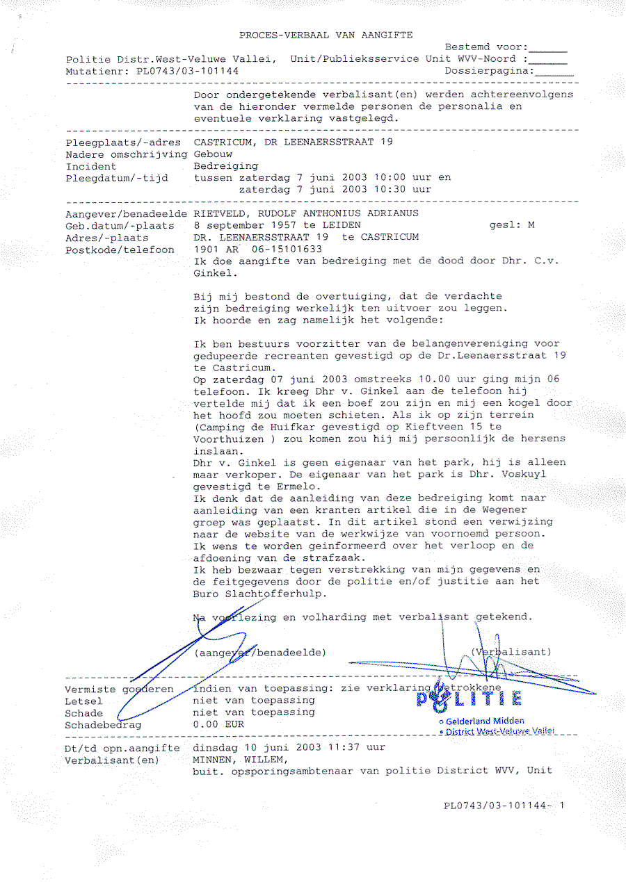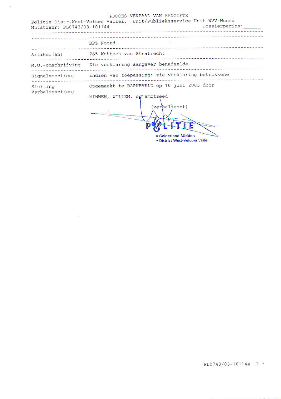 Enige tijd geleden heb ik u een aangetekende brief gestuurd m.b.t. de wettelijke verplichting als kennisdrager (met name beëdigde functionarissen), om vanwege art. 160 Sv en 162 Sv van het wetboek van strafvordering aangifte te doen van strafbare feiten, waarvan u als kennisdrager wetenschap hebt. Tot nu toe heb ik van u geen inhoudelijke reactie hierover mogen ontvangen. Zoals ik u heb laten weten hebt u uw kortgedingrechter mr. W.J.J. Beurskens uit de wind proberen te houden door zijn bewust dwalende vonnis inzake de frauduleuze activiteiten van de ronduit criminele advocaten af te dekken. Voor het overige blijven van kracht de al eerder opgestelde processen-verbaal door Buitengewoon Opsporingambtenaar mevr. D. Nes en collega.