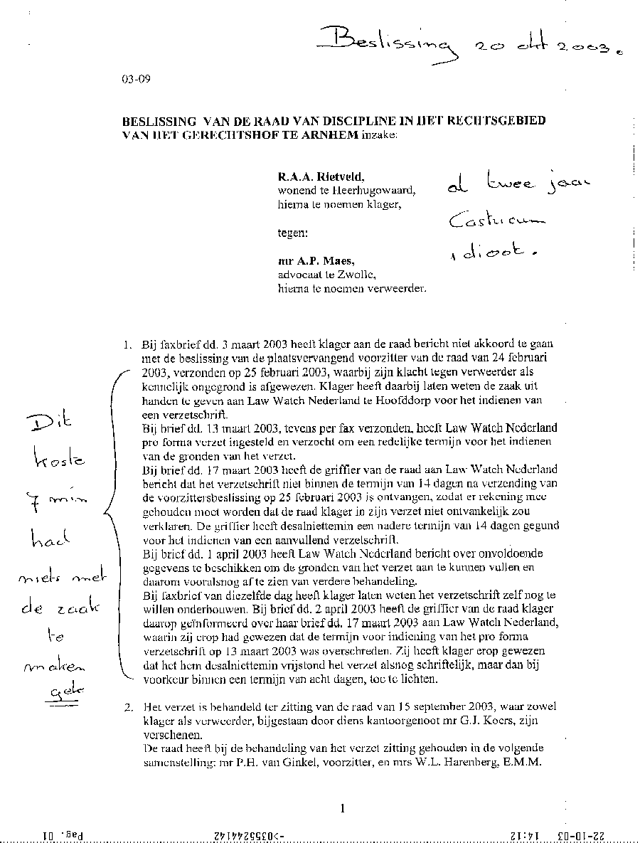 Rietveld kreeg het woord en verklaarde dat meester Maes (die vertegenwoordigd werd door zijn collega mr. Koers) valsheid in geschrifte had gepleegd door een lijst van eisers op te stellen tegen Rietveld wegens diens zogenaamd onrechtmatig handelen ten koste van eigenaren van chalets op recreatieparken, zijnde: "De Valouwe/Bospark Beekbergen" en de "Lithse Ham". Rietveld verwees naar twee gedragsregels m.b.t. art. 738 en 739 van de advocatenwet. Ook moet een advocaat de kosten beperkt houden voor de tegenpartij. Kapotprocederen mag echt niet. Een door meester Maes in kortgeding ingebrachte lijst met eisers ( schijneisers) zoals Rietveld kon bewijzen met documenten uit de burgerlijke stand en andere gegevens van de overheid) waarvan bijna niemand van de vermelde "eisers" wist dat hij of zij betrokken was bij deze rechtszaak. Sterker nog, er stonden namen van mensen op die lijst die al geruime tijd overleden waren. Een zelfs al 18 jaar. Niemand zal toch kunnen ontkennen dat hier valsheid in geschrifte een feit is !! Maar ook de Raad van Discipline niet; of wel ?? Mr. Koers, als woordvoerder van meester Maes, kreeg het woord en bracht in dat Rietveld procedurefouten had gemaakt en dat daarom de zaak niet-ontvankelijk zou moeten worden verklaard. Zowel Mr. van Ginkel - voorzitter - als mr. Koers haalden er iets bij, wat niets met deze zaak te maken had toch in de procedure. Verder argumenteerde hij wat wazig dat uittreksels uit de burgerlijke stand van gemeenten niet duidelijk waren ( Ook niet voor de raad !!). Rietveld interrumpeerde, dat dit niet het geval was, en dat hij wel 22 meter gestapeld papier kon overleggen om het tegendeel te bewijzen. De voorzitter reageerde daarop dat deze zitting geen rechtbankzitting was maar een zitting van de tuchtraad om met name de tucht binnen de beroepsgroep te bewaken. Hij herhaalde dat later nog een keer met: "Wij zijn geen rechtbank" Toen Rietveld dreigde zijn bewijzen (die hij bij zich had) aan de raad te overleggen, zoals hieronder te zien is, kapte de voorzitter de zitting onmiddellijk af als zijnde gesloten. Van een half uur erudiete beoordeling van een uiterst gevoelige zaak bleef van de zitting maar 13 minuten over minus vijf minuten van de introductie van de voorzitter, kennelijk wegens de mogelijk ongewenste onthulling van feiten. De "Raad van Discipline" wordt door mij dan ook omgedoopt tot "Onraad van Discipline" of "Raad van Verdoezeling". Ik weet nog niet wat het uiteindelijk zal worden. Na het ontnemen van het woord aan Rietveld met het brute sluiten van de zitting door voorzitter van Ginkel en waarbij niemand van de vijf overige leden van de Raad vragen hadden gesteld zei ik als waarnemer: "Dat is niet netjes, voorzitter. Ik raad u aan om op het internet de website van de heer Rietveld eens grondig te bekijken". Mijn respect voor voorheen de "Raad van Discipline" is bij deze integraal naar de afvalbak verwezen. Los van de uitspraak over zes weken - rond 27 oktober 2003 - beschuldig ik nu al dit college van het afdekken van kwalijke praktijken zoals van meerdere kanten door anderen ook al is gesignaleerd. Het afdekken met de "Deken" der liefde voor de beroepsgroep is een aanfluiting van wat een integere rechtspleging moet zijn. Daarbij wordt door de verplichte procesvertegenwoordiging - wanneer het tuchtrecht niet goed functioneert - de rechtzoekende burger die afhankelijk is door die verplichte procesvertegenwoordiging de toegang tot de rechter ontzegd, zoals in artikel 17 van de grondwet is vastgelegd. De cover-up (met een te verwachten afwijzing van de eis van Rietveld) om het imago van de advocatuur niet nog verder in de modder te zien zinken, is een gevaar voor de rechtszekerheid die aan burgers bescherming moet bieden tegen onrecht en misbruik van macht. Misbruik van autoriteit o.a. door voorheen de Raad van Discipline legt de bijl aan de wortels van de democratie. Naar gelang bovengenoemde handelwijze van de voorheen de Raad van Discipline tot niets leidt, benadert Rietveld meester Maes dan niet meer rechtsom, maar linksom. P.s.: Van Rietveld vernam ik dat dezelfde voorzitter in april 2003 de zwendelende mr. Sark ondanks zijn schandalige handelwijze ( zie documenten) toch de hand boven het hoofd heeft gehouden. De 'omerta' die bij de maffia het zwijgen afdwingt over criminele zaken, lijkt ook bij voorheen de Raad van Discipline gebruikelijk te zijn.