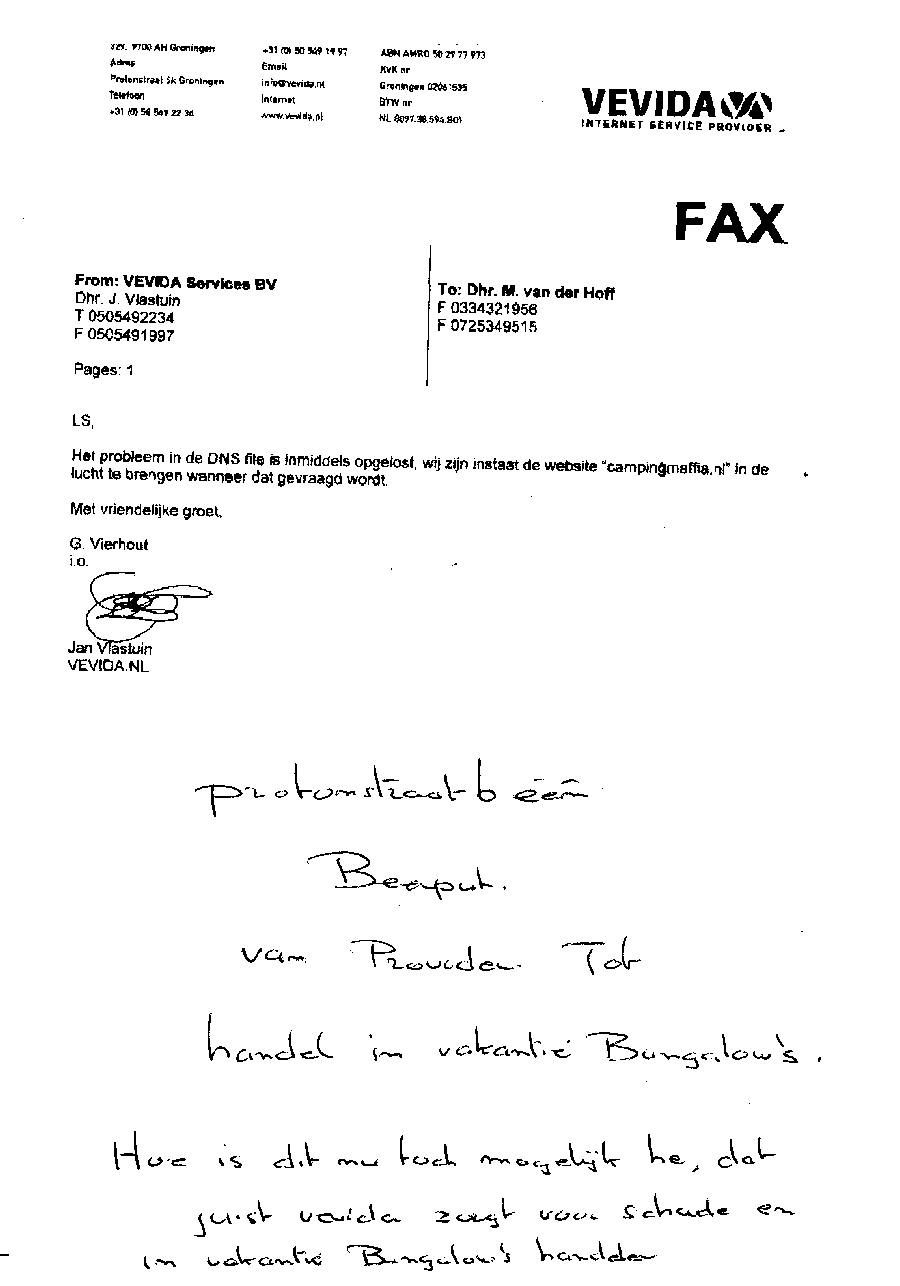 Faxbericht aan mr. Maes van Kees Griesdoorn over schijneisers