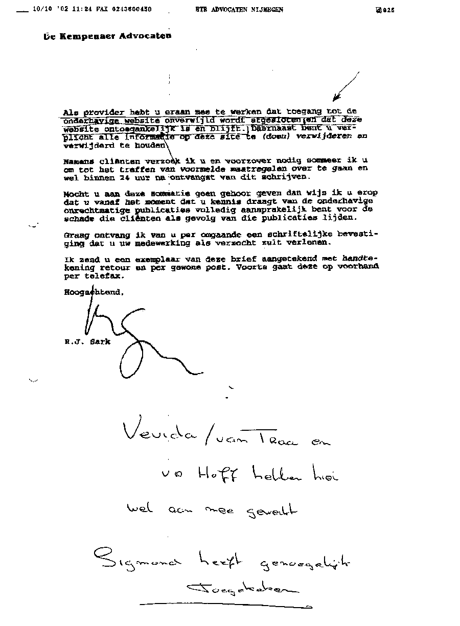 Brief aan SDN met de sommatie om de website van Rietveld te verwijderen
