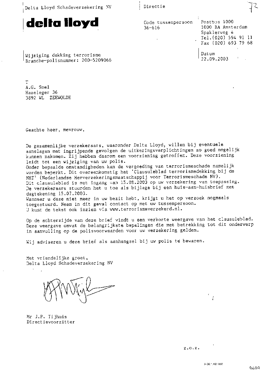 Brief van Delta Lloyd van 22 september 2003 (schadeverzekering aan verzekerde)