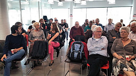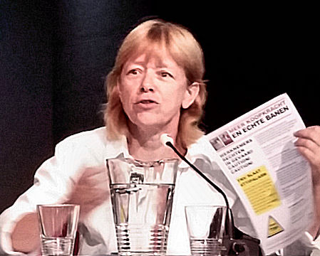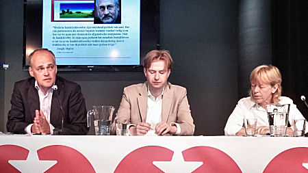 v.l.n.r.: De adviseur van minister Ploumen inzake TTIP, hij bleek bepaald geen tegenstander van het verdrag zoals ook blijkt uit de opstelling van de minister. Daarnaast de vertegenwoordiger van VNO-NCW, de werkgeversorganisatie van vooral het grote bedrijfsleven. Hij was duidelijk voorstander van het verdrag incl. ISDS-tribunaal dat buiten openbare en democratische controle om, vooral Amerikaanse internationale bedrijven het recht geeft een claim op te leggen aan een bedrijf of aan een land dat andere wet- en regelgeving wenst te handhaven, zoals de veel strengere van de EU. Het gaat dan om miljarden, waar advocaten de lippen bij aflikken. Dan de derde vertegenwoordigster van in dit geval de FNV, die fel tegenstander bleek te zijn van met name het ISDS-tribunaal, omdat sowieso de werknemers en burgers te maken zullen krijgen met import uit de VS waar soepeler wetgeving bestaat m.b.t. het milieu en de werknemersrechten, waardoor de positie van de Europese burgers ernstig verzwakt en loondaling en ontrechting op de loer liggen. Voorbeelden van het NAFTA-verdrag met Mexico was een duidelijke waarschuwing. De armoede en werkloosheid als gevolg van het NAFTA-verdrag in vooral Mexico is dramatisch. Juist omdat privatisering van de infrastructuur alles duurder maakt en steeds meer mensen worden uitgesloten van die diensten die voorheen nationaal werden geleverd aan alle burgers; zoals drinkwater, onderwijs, gezondheidszorg en huisvesting. De vierde discussiant was een Belgische professor die eveneens waarschuwde voor effecten van het verdrag, juist vanwege het ISDS-tribunaal. Er is geen democratische of rechterlijke controle over het claimrecht van een multinational dat wil concurreren op een buitenlandse markt, waar de wettelijke regels strenger zijn t.a.v. bijv. het milieu en de volksgezondheid. een schadeclaim ontstaat vanzelf, waardoor bij weigering die import toe te laten een claim van zelfs miljarden kan worden opgelegd. Dit zonder dat een bedrijf of wanneer een land of bedrijf zich daartegen verzet. Het is je reinste neokolonialisme. Bij het niet-betalen van die claim wordt het land of bedrijf op een zwarte lijst gezet, waardoor toegang tot de internationale kapitaalmarkt wordt geblokkeerd. Pure chantage dus. Als laatste panellid was het SP-lid in het Europese parlement, Anne-Marie Mineur dat eveneens zich zorgen maakte over vooral het ISDS-tribunaal dat ongebreideld schadeclaims kan indienen tegen landen en bedrijven die vanwege lokale wetten bezwaar maken tegen vestiging of impost van Amerikaanse bedrijven, of export van producten naar de EU die niet voldoen aan de milieueisen en/of voedselveiligheidscriteria die in West-Europa de bevolking beschermen tegen schadelijke stoffen. Na de presentatie en paneldiscussie sprak in ruim een kwartier prof. dr. Ewald Engelen zijn column uit, waarin hij kristalhelder de gevaren etaleerde van dit TTIP-verdrag en de empathieloze effecten daarvan. Hij waarschuwde klip en klaar tegen de ontrechting van werknemers en burgers als gevolg van de niet openbare claimcultuur die met het ISDS-tribunaal landen en nationale bedrijven met miljarden aan schadeclaims kunnen bedreigen. Dit voor zogenaamde uitval van winstmogelijkheden; en dan de belastingbetaler laten opdraaien voor een rechtsgang die buiten iedere democratische controle plaatsvindt. Een bedrijf dat een dergelijke claim tegen zich krijgt gaat onherroepelijk failliet, waardoor de Amerikaanse exporteur de markt kan overnemen met geld toe van het aangeklaagde bedrijf of land. Je reinste neokolonialisme. Maar niet alleen de VS kan dit meedogenloze spel spelen. Ook Nederland met zijn enorme aantal brievenbusmaatschappijen kan omgekeerd hetzelfde doen. In dit geval zelfs tegen de VS. Ik alle gevallen zijn de werknemers en belastingbetalers van een land het haasje met ontrechting en door schadeloosstelling te betalen aan een multinational die zich beroept op het TTIP-verdrag met de juristerij van het ISDS-tribunaal. Wanneer je het een en ander op een rij zet, dan blijkt dat de nationale overheden van de EU en ook van de VS niets meer te zeggen hebben over de wet- en regelgeving in eigen land. Juist in combinatie met het ISDS-tribunaal dat de nationale wetgeving overrulet. Ik heb een aantal mensen op deze bijeenkomt een visitekaartje gegeven met het doel om de structuur van het geldsysteem waar alles aan gekoppeld is bespreekbaar te krijgen. Daarom is deze link zo belangrijk met het ontwerp voor Tweede Kamerlid Arnold Merkies (SP) om de regering met een motie te verzoeken alle prominente bestuurders en volksvertegenwoordigers, zowel landelijk als lokaal, het parlementair debat te laten bekijken dat 20 november 2014 plaatsvond in het Britse Lagerhuis. Het onderwerp was: 'Money creation and Society', ofwel het creëren van nieuw geld uit het absolute niets, door wie en onder welke condities, waardoor de maatschappij kan functioneren. Bij gebrek aan geldcreatie (zoals nu door onze banken gebeurt) op bepaalde plaatsen in de economie, ontstaat automatisch armoede en werkloosheid, zoals nu in o.a. Griekenland goed te zien is. Opvallend is dat nog nergens wordt gesproken over de kern van het economische, monetaire en sociale systeem. Namelijk over het geld zelf. Niemand zegt of weet wie het maakt, waar het vandaan komt en weer verdwijnt, en of er rente moet worden betaald over iets wat feitelijk niet bestaat als geld maar wel als schuld. Meestal is het alleen maar schuld aan een geldscheppende bank in een computer. Ook is het mistig wanneer je praat over kapitaal, geld, liquiditeit of vermogen. Zelfs Nobelprijswinner prof. dr. Jan Tinbergen kon geen antwoord geven op mijn vraag wat geld werkelijk is. Hij schreef mij: " Van geld heb ik geen verstand". Er zijn begrippen rond het geld die elkaar lang niet altijd dekken. Zie bijvoorbeeld de geldschepping van de ECB van Mario Draghi met 60 miljard nieuwe euro's per maand. Wat voor geld is dat? Geld in de zin van betaalmiddel of ruilmiddel? Of is het alleen maar een op