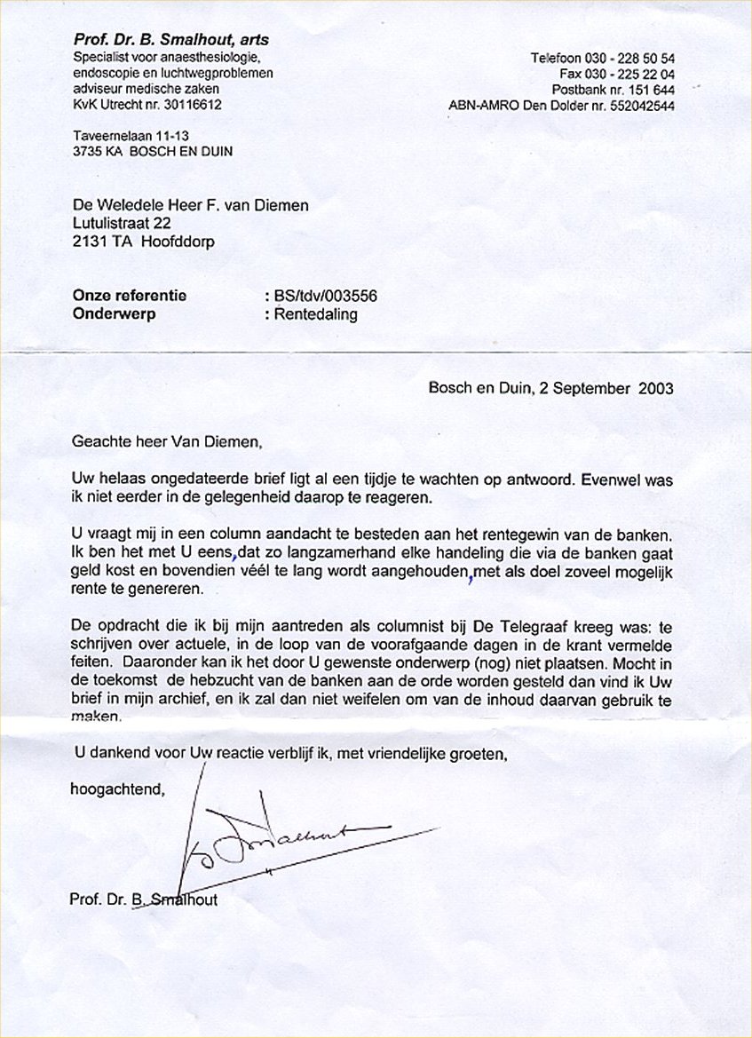 Het onderwerp dat ik zo graag onder het Nederlandse publiek wil brengen is het onterechte rentegewin van de banken. Zoals u weet regelen de banken al onze geldtransacties, maar houden ons geld veel te lang vast. Hierdoor wordt honderden miljoenen euro's uit onze samenleving onttrokken, omdat met goedkeuring van de vakbonden ons het girale betalingsverkeer door de strot is geduwd, net als de euro, met alle economische gevolgen van dien. Om een lang verhaal kort te houden verwijs ik graag naar de bijgevoegde stukken van deze brief.