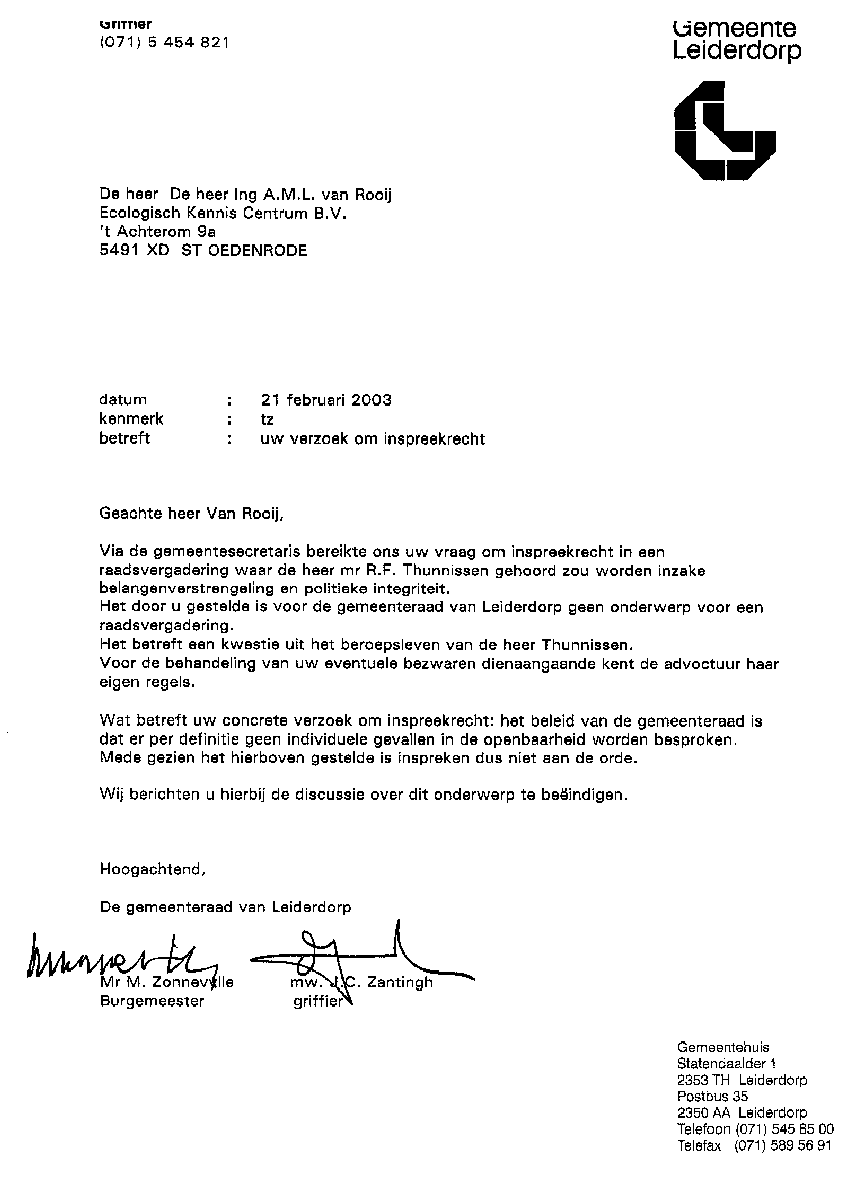 Sint Oedenrode, 19 februari 2003. Uw reactie heb ik in goede orde ontvangen. Mijne dank daarvoor. Uit de inhoud maak ik op dat u zich niet inhoudelijk ( op feiten ) in deze kwestie wenst te verdiepen. Tevens maak ik op dat u met mij daarover ook niet inhoudelijk wenst te praten om te komen tot een feitelijk onderbouwd geheel, maar dat u mij zonder te komen met feiten via de media zwart wenst te maken. Uw persbericht is dan ook gebaseerd op aannames, veronderstellingen die geen enkele feitelijke grondslag hebben. Omdat u uw reactie als persbericht heeft laten uitgaan stel ik de pers ( media) voor om daarover een persconferentie te beleggen. In die persconferentie zal ik met de feitelijke bewijzen komen. Ik ga ervan uit dat u en de heer Thunnissen daarbij dan ook aanwezig zullen zijn. Tevens wil ik u kenbaar maken dat hier sprake is van "collusie". Voor meer informatie daarover lees www.sdnl.nl/nvvk.htm en www.sdnl.nl/epon-3.htm en www.sdnl.nl/ekc-mail.htm en https://www.katholieknieuwsblad.nl en https://www.katholieknieuwsblad.nl/actueel/kn1822a.htm en http://www.sdnl.nl/pamela-10.htm en Voor wat betreft deze zaak en dhr. Thunnissen, lees http://www.sdnl.nl/vd-linden6.htm Een kopie van deze reactie heb ik verstuurd naar pers en media, waaronder het Brabants Dagblad, Twee Vandaag en diverse Tweede Kamerleden van de Landelijke PvdA en andere partijen ( zie CC ) Voor nadere informatie kunt u terecht bij.