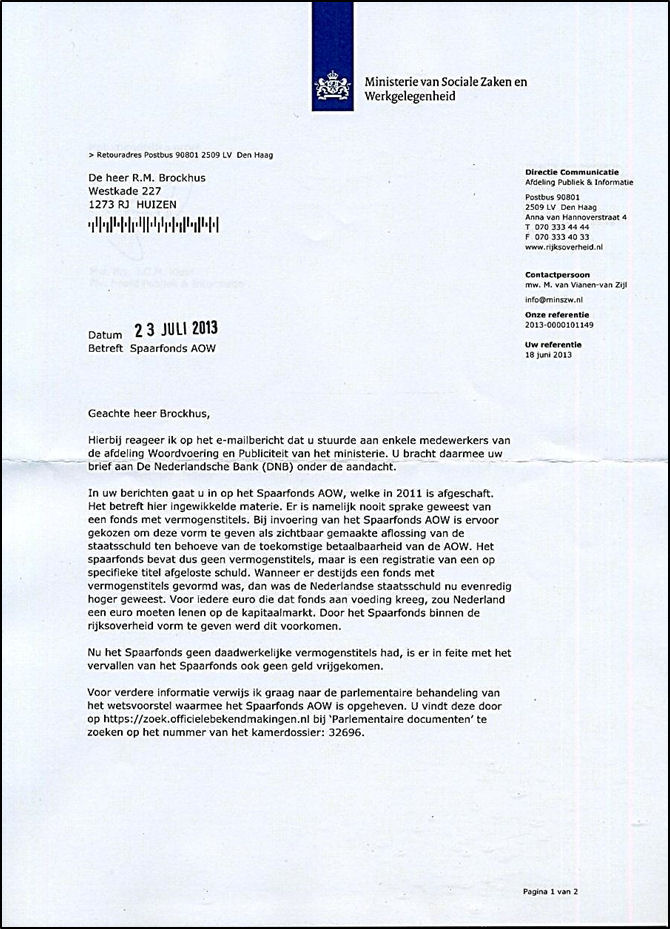 Als dat wel zo was dan is er ook nog sprake van samenspanning in een criminele organisatie van zowel de pers als van de leden van de Tweede Kamer vanaf de oprichting van het spaarfonds voor de AOW. Dat is kiezersbedrog, boekhoudfraude en ronduit pure diefstal van 50,9 miljard die ten laste van de begroting van het ministerie werden weggewerkt met het inkopen van eigen aandelen, zoals dat in het bedrijfsleven dat geld over heeft soms gebeurt. We zitten ook nu weer met een liegende en bedriegende overheid die in uw brief erkent dat we schielijk bedrogen zijn en nog worden. Hoe u er bij komt dat er geen vermogenstitels zijn t.a.v. het fonds, slaat als een tang op een varken, omdat een parlementair goedgekeurde boeking van echt geld van de begroting jaarlijks is gedoteerd aan het Fonds.