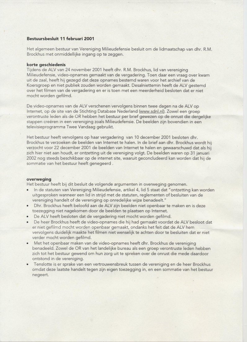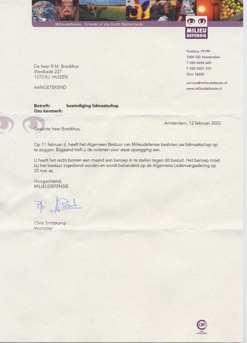 Hieronder ziet u de brief die ik ontving van het bestuur van Milieudefensie van 12 februari 2002. De inhoud spreekt voor zichzelf. Zeker is dat ik gebruik zal maken van het beroep tegen deze beslissing, al was het maar dat er aperte onjuistheden in worden weergegeven. Daarover zal ik spreken op de Algemene ledenvergadering op 25 mei 2002 in Slijk-Ewijk bij Nijmegen.