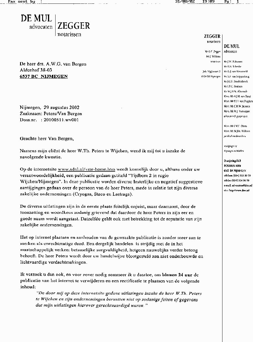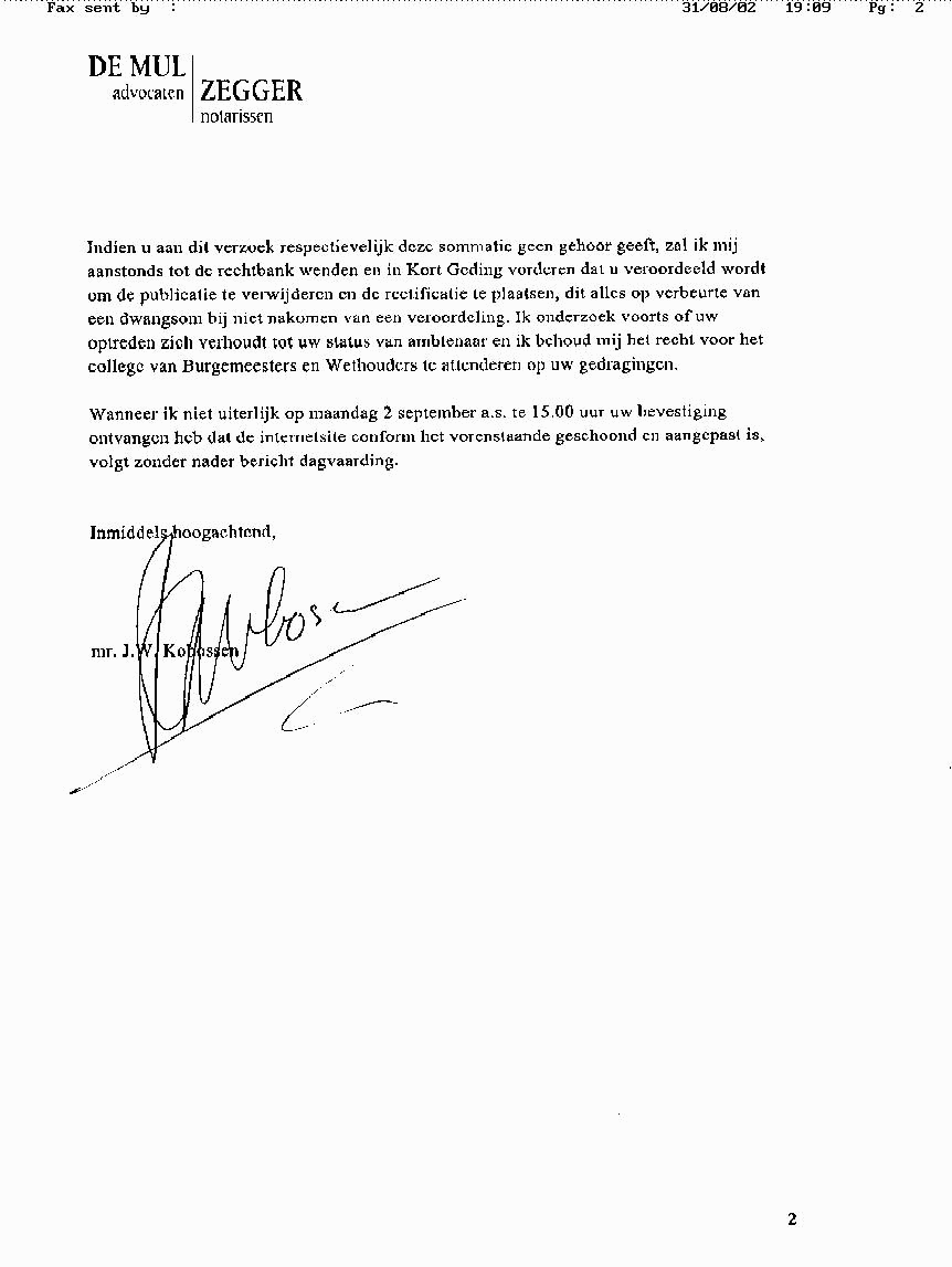 Per e-mail en per fax (024- 3240678) verstuurd Geachte heer Kobossen, Uw brief van 29 augustus 2002 heb ik in goede orde ontvangen. Uiteraard kan ik niet aan uw verzoek voldoen om de door u aangehaalde internetpagina te doen verwijderen en min of meer mijn excuses aan te bieden voor hetgeen daarin vermeld stond. Aangezien u niet concreet aangeeft welke passages onjuist zijn beschouw ik uw brief als een poging tot intimidatie en een rechtstreekse inbreuk op mijn vrijheid van meningsuiting. Wel was uw brief aanleiding om de internetpagina die over bovengenoemd bedrijf gaat enigszins te actualiseren in verband met de ook u bekende recente ontwikkelingen. Tevens wordt uw brief van 29 augustus 2002 op internet geplaatst. Evenals het aanvalsplan van de brandweer, waaruit blijkt dat het gasbedrijf van uw cliënt geen brandbeveiligingssysteem heeft. In verband met uw voornemen om intimiderend op te treden in de richting van mijn werkgever onderzoek ik momenteel welke juridische stappen het meest geeïgend zijn om u te vervolgen. Hierover kunt u binnenkort nader bericht verwachten.