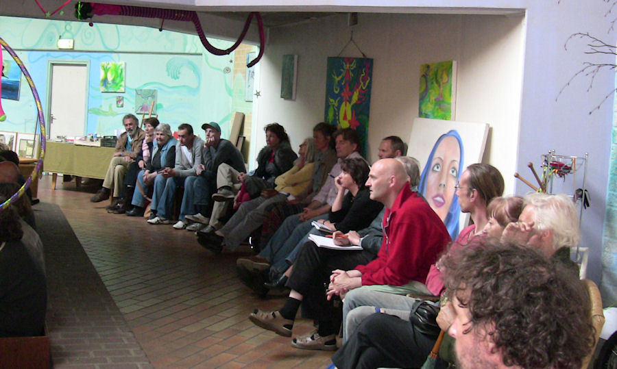 Nieuwe ideeën uit creatieve geesten brengen de cultuur tot leven Gerard Beukeveld Presenteert nieuwe bodemreinigingstechniek (video) Met Powerpoint presentatie of Powerpoint Dia-show en PDF-document Frans Cuppen over zonne-energie voor hele de wereld (video) Met Powerpoint presentatie of Powerpoint Dia-show en PDF-document Lea Manders Partij Mens en Spirit, de politieke cultuur verandert Heleen van Haaften - verband bodemgesteldheid en volksgezondheid Janneke Monshouwer - Hundertwasser, een architect Michael de Vos - Gezonde architectuur Melchior en Jendayi presenteren cultuur-centrum de Waayenberg Frans van 't Hul - wat is ecologie en duurzaam bouwen Marc Daelemans - waterzuivering met planten en betere grondstructuur Hans van Steenbergen - Proco alternatieve geld- en verrekensystemen Een aandachtig gezelschap luistert naar de lezingen Stichting Sociale Databank Nederland Internet site: http://www.sdnl.nl/waayenberg.htm E-mailadres: sdn@planet.nl Disclaimer