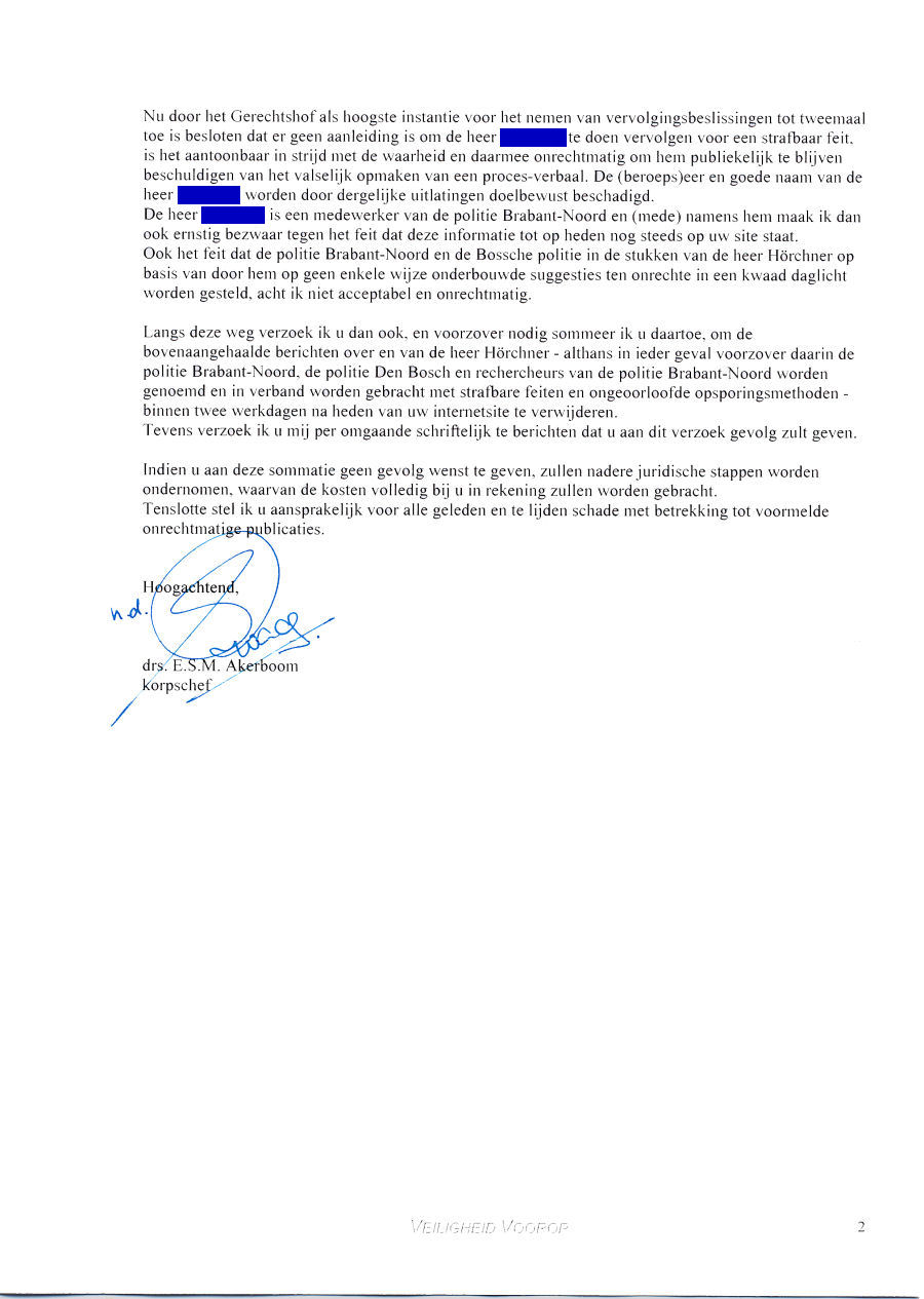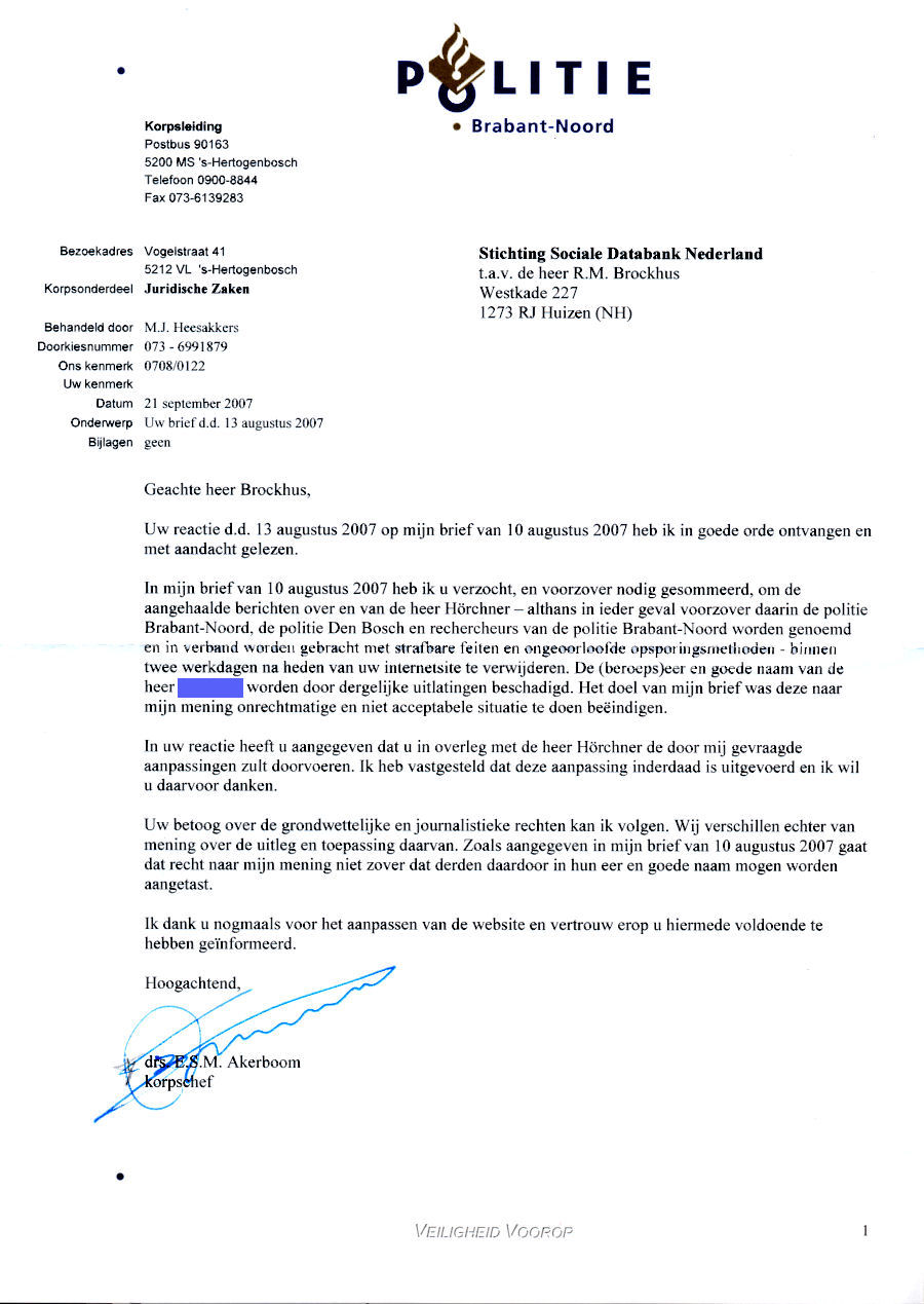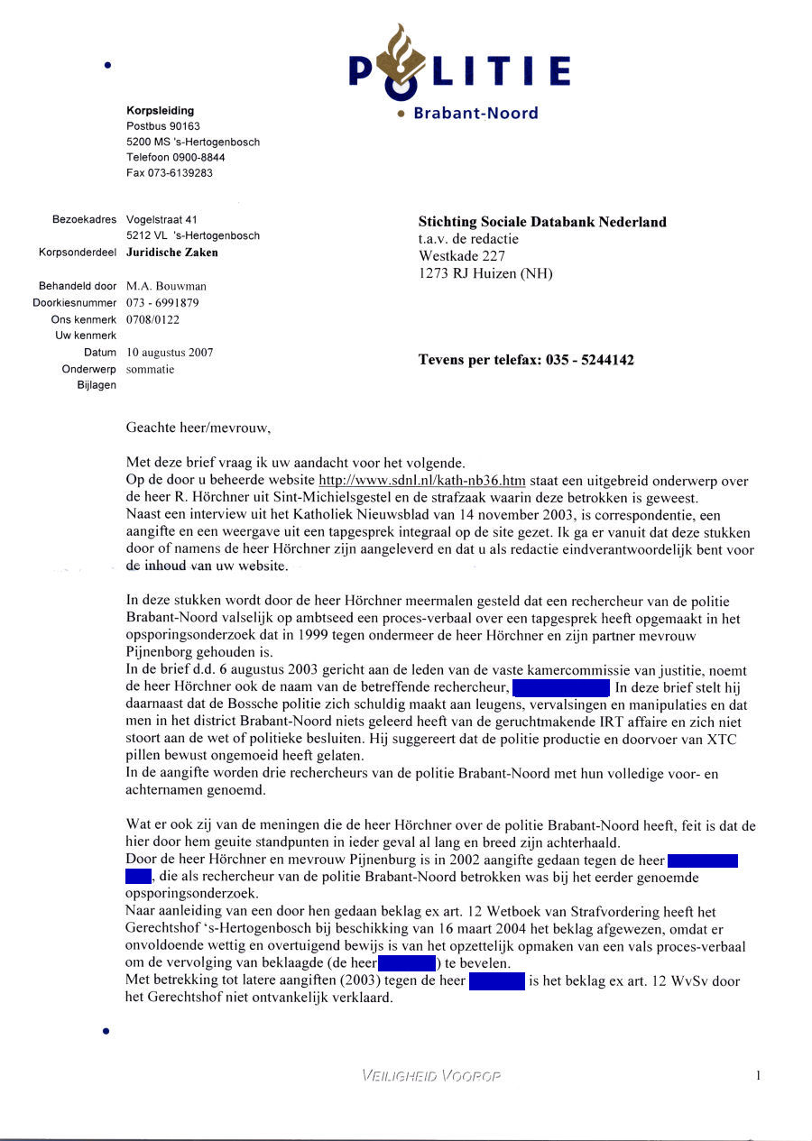 Commentaar: Alleen in geval van kwade trouw zou kunnen worden gesproken van onrechtmatig handelen, maar dan zou een simpel verzoek de zaken kunnen regelen i.p.v. te dreigen met juridische consequenties. In geval van Robert Hörchner is dat niet het geval. Alle informatie komt van buitenaf of is expliciet verzocht om het aangeleverde materiaal te publiceren. Dat de korpschef van Politie in 's-Hertogenbosch voor het gemak de verantwoordelijkheid voor de inhoud van de artikelen van het Katholiek Nieuwsblad en documenten van de heer Hörchner persoonlijk op het bord van de SDN legt, gaat veel te ver. Wanneer dat wel zo was, zoals dat in de laatste alinea staat, dat elke publicatie van welke beschuldiging dan ook voor alle media voortaan verboden is, op straffe van schadevergoeding voor van alles en wat maar aan schade te verzinnen is, dan kunnen kranten, weekbladen en omroepen alleen nog maar brood en spelen verkopen. Controle op de macht en fraude bij de overheid en bedrijven is dan compleet uitgesloten. Of zien we dat verkeerd? Het zou echt het einde van elke vorm van menings- en publicatievrijheid zijn (Grondwet art. 1) om zaken niet meer openbaar te kunnen maken die fout zitten. Want hoever gaat de schadeclaim terug van o.a. rechercheur van A. van R. in geval hij zou zijn gescheiden door spanningen met zijn werk ?? Is dat incl. zijn bruiloftsfeest van tien jaar terug, omdat zijn vrouw is weggelopen en de 'investering' in zijn huwelijk verdampt is ?? De korpschef gaat niet alleen op de stoel van de rechter zitten, maar stelt ook uit de losse pols zelf de schadeclaim vast. Dat wordt feest in 's-Hertogenbosch....!! En procederen op kosten van een ander is ook niet mis, zoals hij stelt. Zolang geen duidelijkheid bestaat over de werkelijke gang van zaken in de affaire Hörchner (want de uitspraken van het Hof zeggen eigenlijk alleen maar dat fraude gepleegd door de agenten niet bewezen is; en dus niet ontvankelijk. En dat die uitspraken zijn gedaan in 2003 en 2004, alsof er daarna niets gebeurd is !! Dat betekent heel eenvoudig dat de onderste steen nog lang niet boven is. Dat sluit onrechtmatig handelen van deze functionarissen helemaal niet uit. Want zoals ook in andere zaken is voorgekomen, is het afdekken van fraude bij overheidsdiensten kennelijk heel gebruikelijk. Voorbeelden als de affaire van Karel de Werd, Johan Veldhuis, Ad van Rooij, Nico Burhoven Jaspers, en nog heel veel andere zaken geven een helder beeld van de verwording van de zogenaamde rechtsstaat Nederland. Deze brief van de korpschef vermeldt op zich ook de namen van de beschuldigde agenten. Dus wat is nu het bezwaar van de korpschef?? Want hoofdofficier mr. Craemer stelt zelf in de uitzending: "In het interview met Peter R. de Vries/hoofdofficier mr. Craemer, uitzending van 27 mei 2004, aflevering 15.: